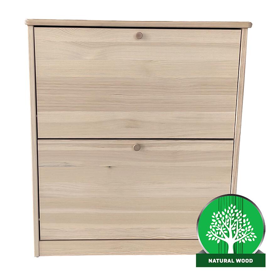 Szafka na buty 2KL sosna to mebel, który łączy klasyczny design z funkcjonalnym rozwiązaniem do przechowywania obuwia. Wykonana w całości z drewna sosnowego w jasnym wybarwieniu, świetnie wpisuje się w różnorodne aranżacje wnętrz, od tradycyjnych po nowoczesne. Jasne, drewnopodobne fronty oraz matowe wykończenie korpusu dodają lekkości i naturalnego ciepła, a jednocześnie pozwalają utrzymać porządek w przedpokoju.