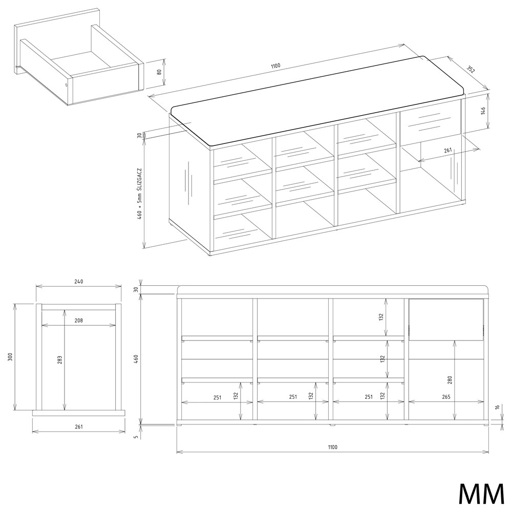 Praktyczna szuflada na prowadnicach rolkowych doskonale sprawdzi się na klucze, rękawiczki czy środki do pielęgnacji butów, a wysoka boczna komora pozwala na schowanie kozaków, parasoli lub toreb. Szafka została wzbogacona o tapicerowane siedzisko w szarym kolorze, które zapewnia komfort podczas zakładania obuwia. Kolorystyka sprawia, że mebel doskonale komponuje się zarówno z nowoczesnymi, jak i klasycznymi aranżacjami wnętrz.