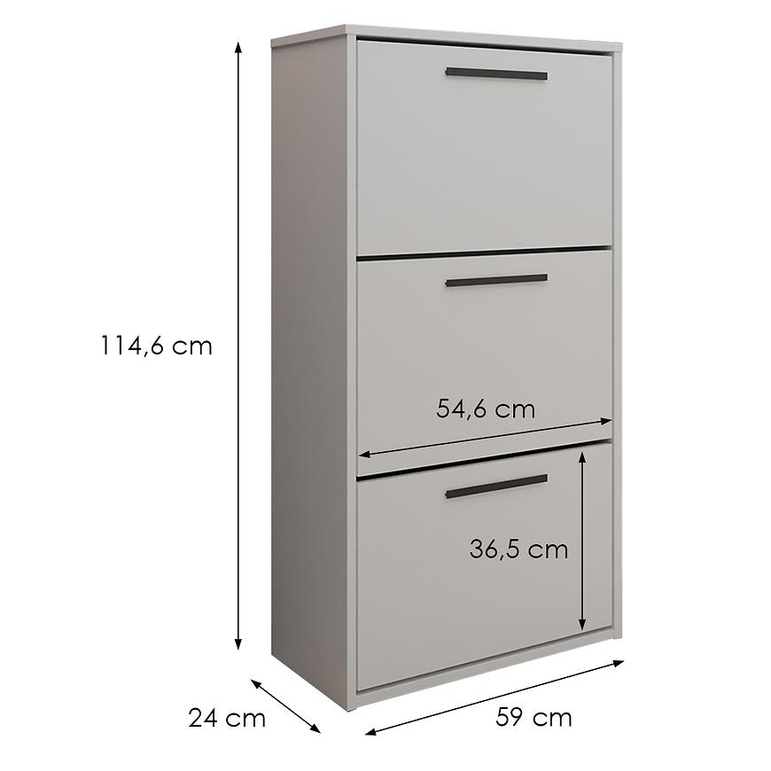 Szafka na buty Asper stojąca w kolorze biały/biały to funkcjonalne i stylowe rozwiązanie do nowoczesnych wnętrz. Dzięki kompaktowym wymiarom – wysokości 114,6 cm, szerokości 59 cm i głębokości zaledwie 24 cm – idealnie sprawdzi się nawet w wąskich przedpokojach, zapewniając praktyczne miejsce do przechowywania obuwia. Całość wykonana jest z laminowanej płyty wiórowej w matowym wykończeniu, co zapewnia estetykę oraz trwałość mebla. Jasna kolorystyka frontów i korpusu optycznie rozjaśnia przestrzeń, a prosty design wpisuje się w nowoczesny styl. Mebel wymaga samodzielnego montażu i pochodzi z kolekcji ASPER. Waga szafki wynosi 22,8 kg.
