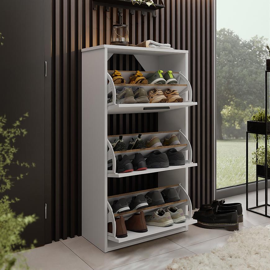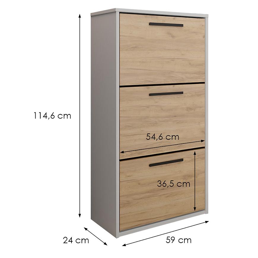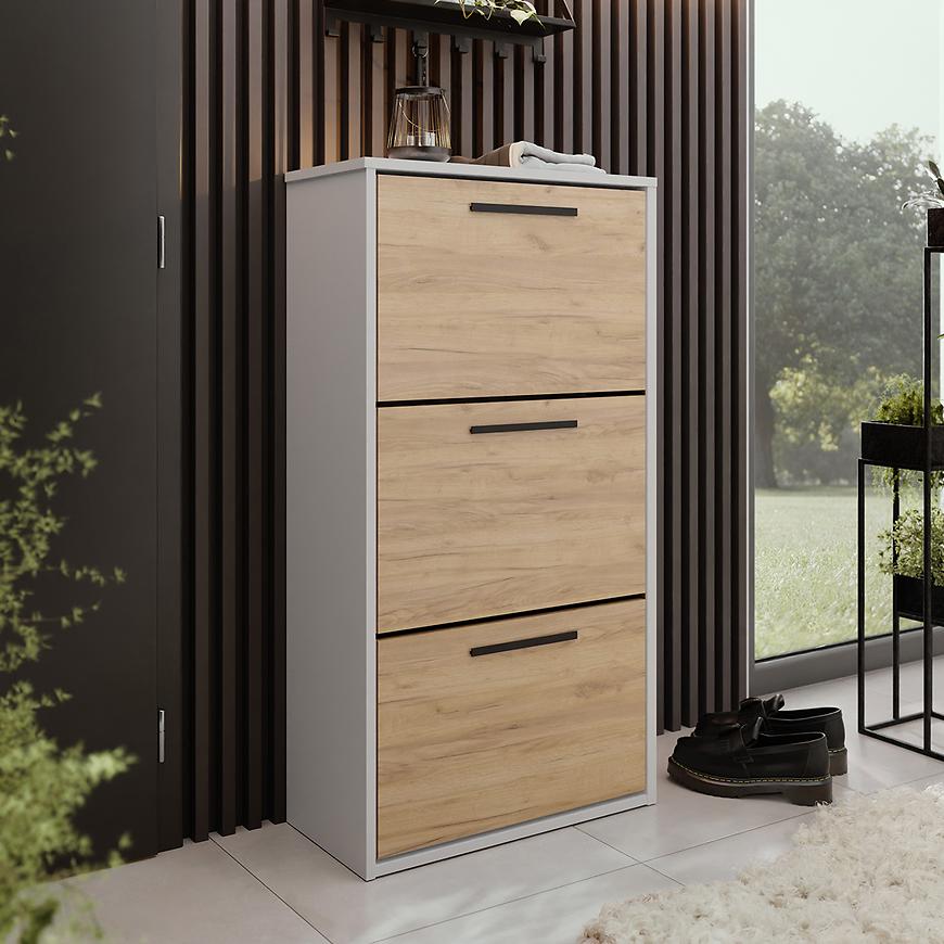 Szafka na buty Asper stojąca w wybarwieniu craft/biały to praktyczny mebel, który doskonale łączy nowoczesny styl z funkcjonalnością. Zgrabna forma o wymiarach 114,6 cm wysokości, 59 cm szerokości i 24 cm głębokości sprawia, że świetnie odnajduje się nawet w niewielkich przestrzeniach. Fronty w odcieniu dąb craft w połączeniu z białym korpusem tworzą estetyczne, jasne zestawienie o drewnopodobnym charakterze. Całość została wykonana z trwałej płyty wiórowej laminowanej z matowym wykończeniem, co zapewnia solidność i łatwość w utrzymaniu czystości. Szafka pochodzi z kolekcji ASPER i wymaga samodzielnego montażu. Waży 22,8 kg.