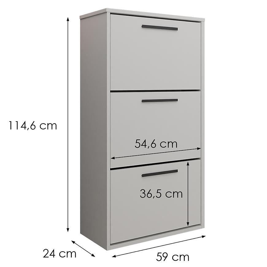 Mebel ma kompaktowe wymiary: 114,6 cm wysokości, 59 cm szerokości i 24 cm głębokości. Korpus i fronty wykonane są z trwałej płyty wiórowej laminowanej o matowym wykończeniu, co zapewnia łatwość czyszczenia oraz estetyczny wygląd. Dzięki formie wiszącej, szafka daje wrażenie lekkości i ułatwia utrzymanie porządku pod meblem.