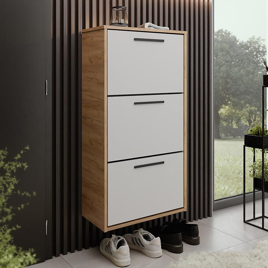 Szafka na buty Asper Wisząca Fr. Biały/Craft to nowoczesny i praktyczny mebel, który doskonale sprawdzi się w każdym przedpokoju. Połączenie białych frontów z korpusem w dekorze dąb craft tworzy stylowy kontrast, który wprowadza do wnętrza naturalną elegancję i świeżość.