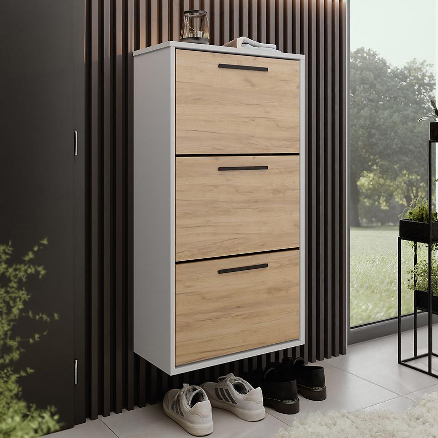 Szafka na buty Asper Wisząca Fr. Craft/Biały to stylowy i funkcjonalny mebel, który idealnie sprawdzi się w nowoczesnym przedpokoju. Połączenie ciepłego dekoru dąb craft na frontach z białym korpusem tworzy uniwersalną i ponadczasową kompozycję, doskonale pasującą do jasnych, naturalnych aranżacji wnętrz.