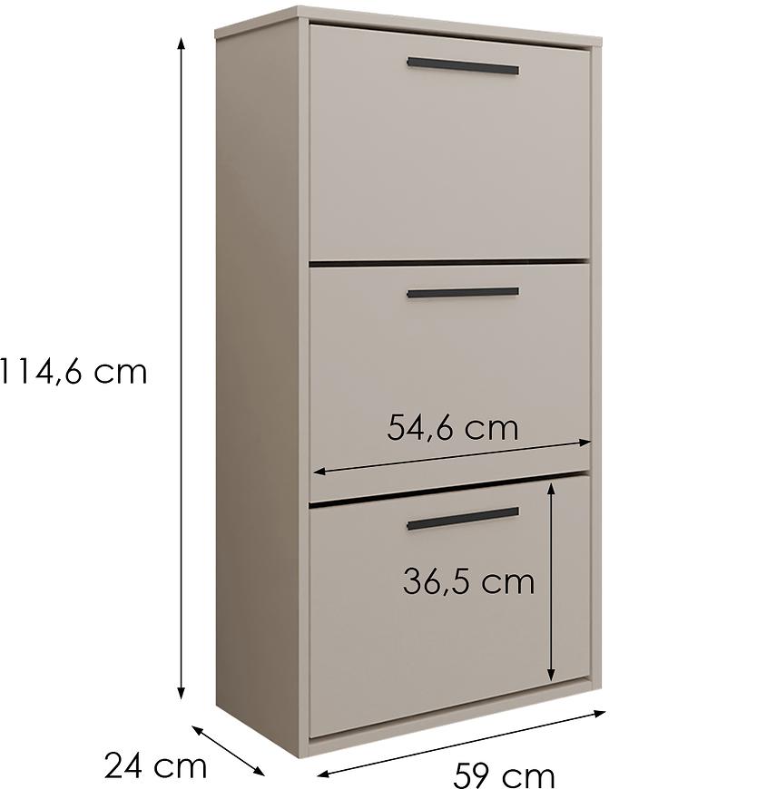 Wymiary szafki to 114,6 cm wysokości, 59 cm szerokości oraz 24 cm głębokości, co sprawia, że jest praktycznym rozwiązaniem do przechowywania obuwia, a wisząca forma pozwala zaoszczędzić miejsce na podłodze, utrzymując porządek w przedpokoju lub innym pomieszczeniu.