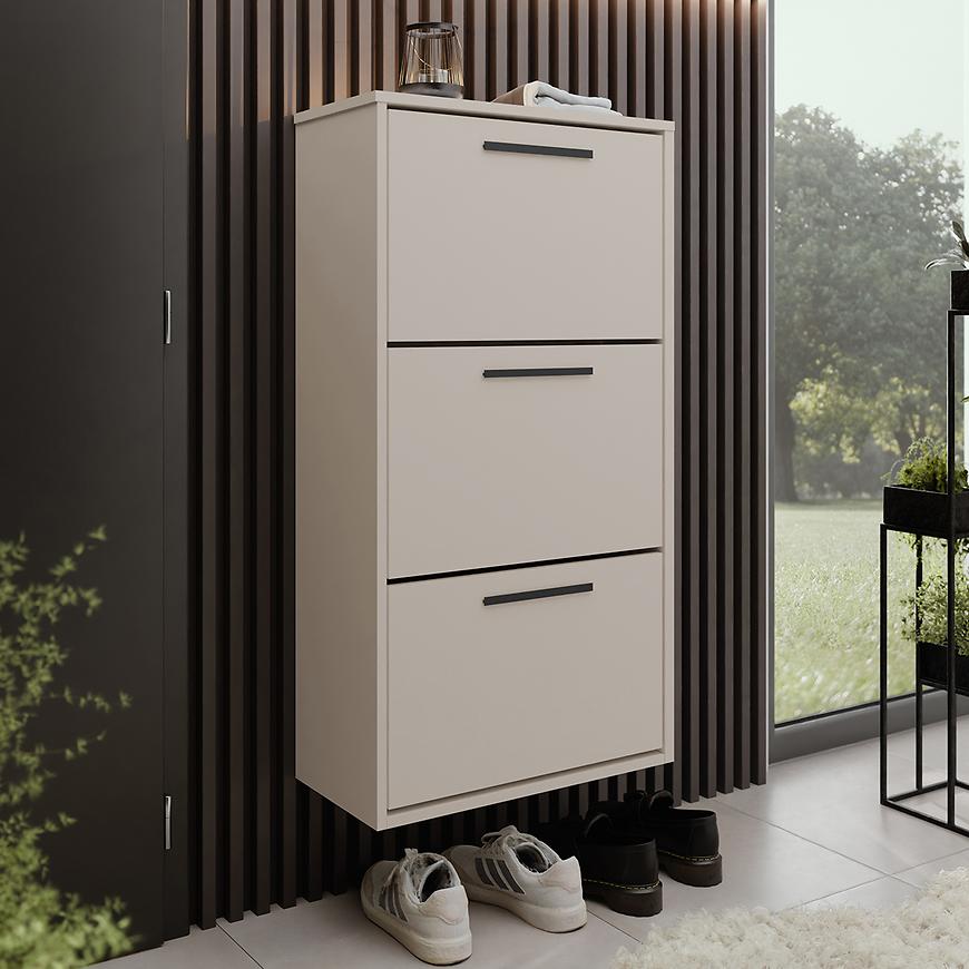 Szafka na buty Asper Wisząca Fr. Kaszmir/Kaszmir to elegancki i funkcjonalny mebel z kolekcji ASPER, stworzony z myślą o nowoczesnych wnętrzach. Wykonana z laminowanej płyty wiórowej o matowym wykończeniu, w delikatnym beżowym odcieniu kaszmir, nadaje przestrzeni ciepły i subtelny charakter.