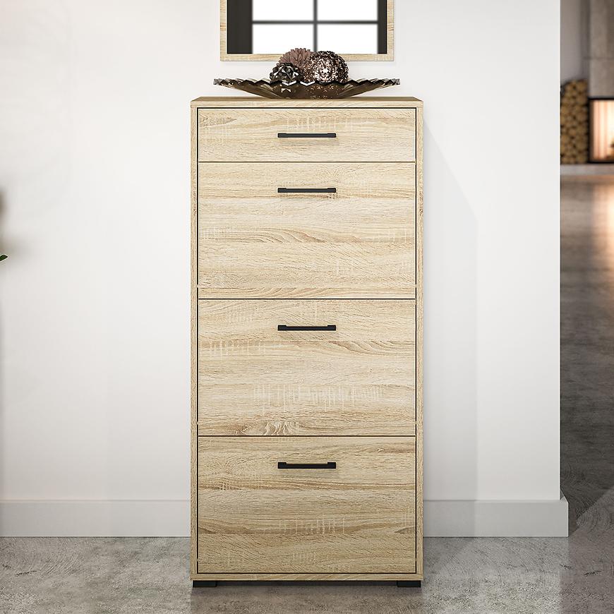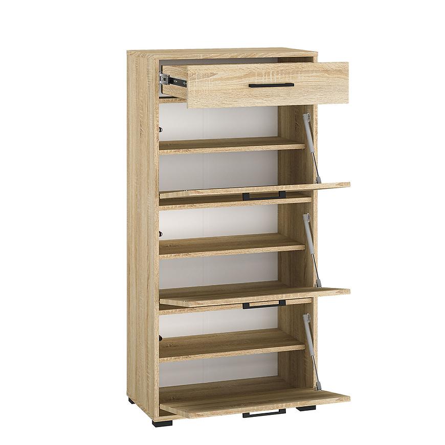 Kolor dąb sonoma nadaje szafce naturalnego, ciepłego charakteru, jednocześnie harmonizując z różnymi stylami aranżacyjnymi. Konstrukcja oparta na płycie wiórowej laminowanej gwarantuje solidność i trwałość mebla, co sprawia, że szafka na buty Caro będzie służyć przez wiele lat.