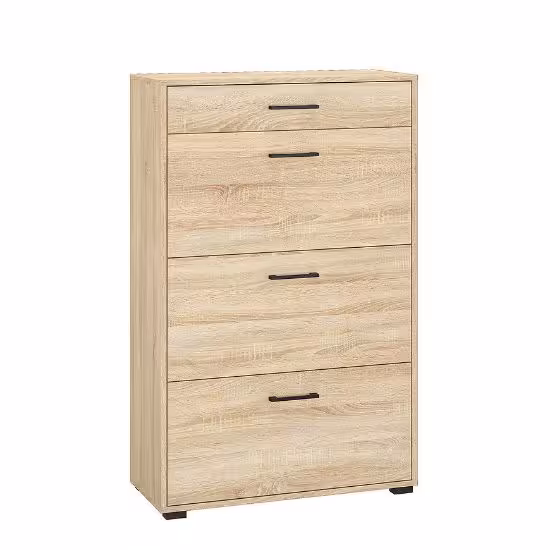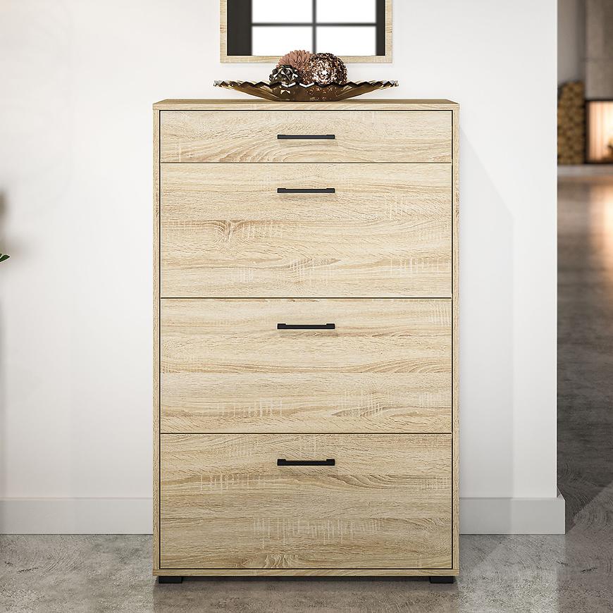 Kolor dąb sonoma nadaje szafce naturalnego, ciepłego charakteru, jednocześnie harmonizując z różnymi stylami aranżacyjnymi. Konstrukcja oparta na płycie wiórowej laminowanej gwarantuje solidność i trwałość mebla, co sprawia, że szafka na buty Caro będzie służyć przez wiele lat.