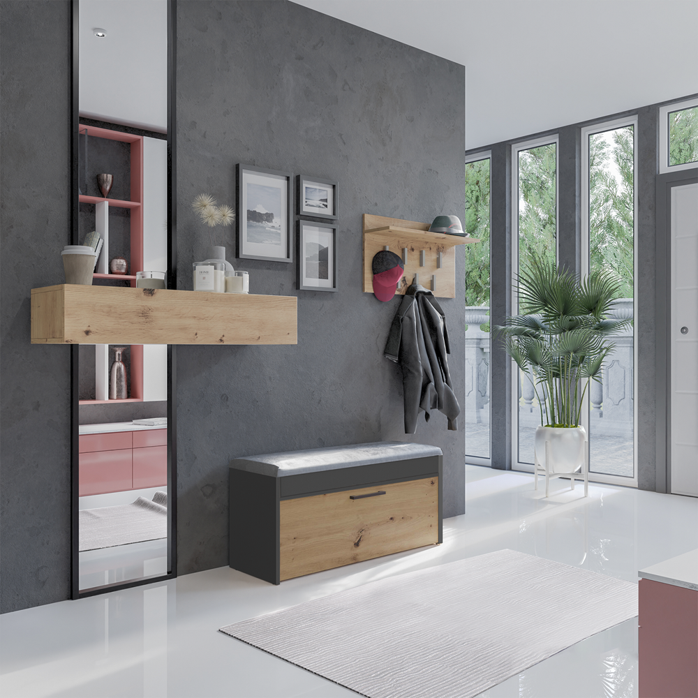 Szafka na buty Cella w kolorze antracyt/dąb artisan to bardzo praktyczny mebel do każdego przedpokoju. Szafka na buty składa się ze schowka o wymiarach 30x96x8 cm i tapicerowanym siedziskiem. Materiał wykonania to płyta laminowana, a obrzeża – wykończone tworzywem ABS. Mebel do samodzielnego montażu.