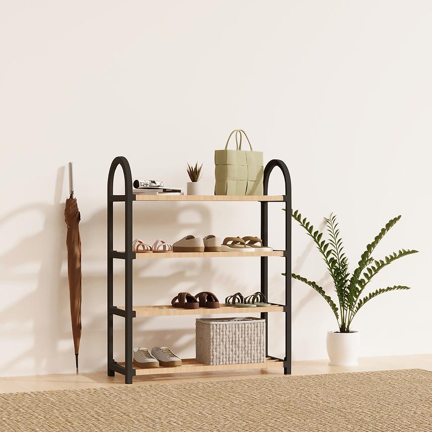 Szafka ma kompaktowe wymiary – 64 cm wysokości, 51 cm szerokości i 18 cm głębokości – dzięki czemu doskonale sprawdzi się nawet w mniejszych pomieszczeniach, takich jak przedpokój czy korytarz. Naturalny odcień drewna połączony z czarnymi akcentami tworzy harmonijną, nowoczesną kompozycję, która podkreśli charakter wnętrza.
