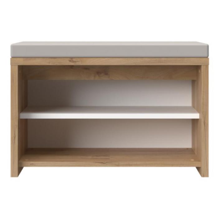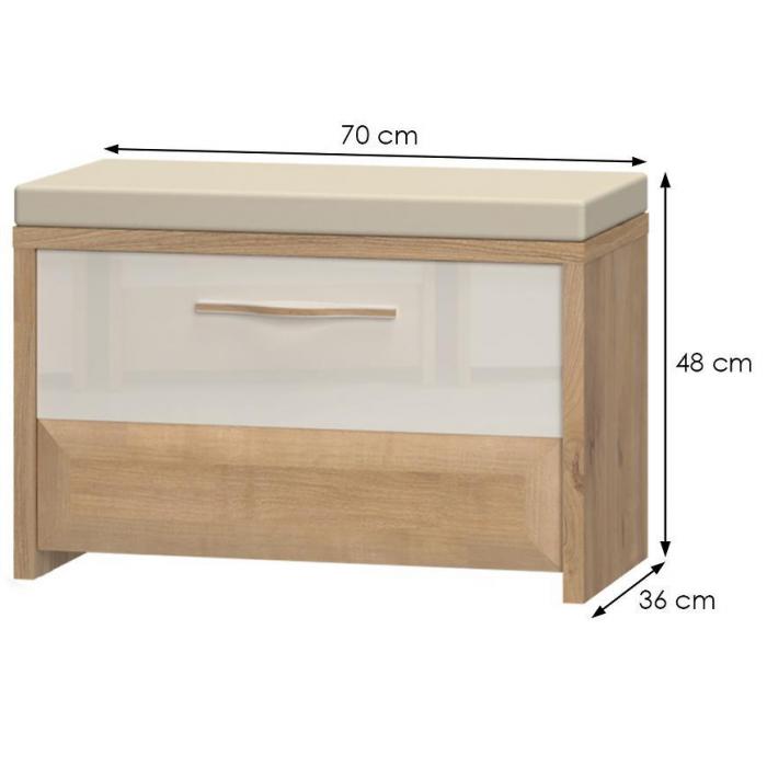 Szafka na buty Gala w kolorze beige połysk/pacific walnut mat to bardzo praktyczny mebel do każdego przedpokoju. Szafka na buty posiada jedną szafkę na obuwie oraz siedzisko. Materiał wykonania to płyta wiórowa lakierowana/płyta wiórowa laminowana. Mebel do samodzielnego montażu.