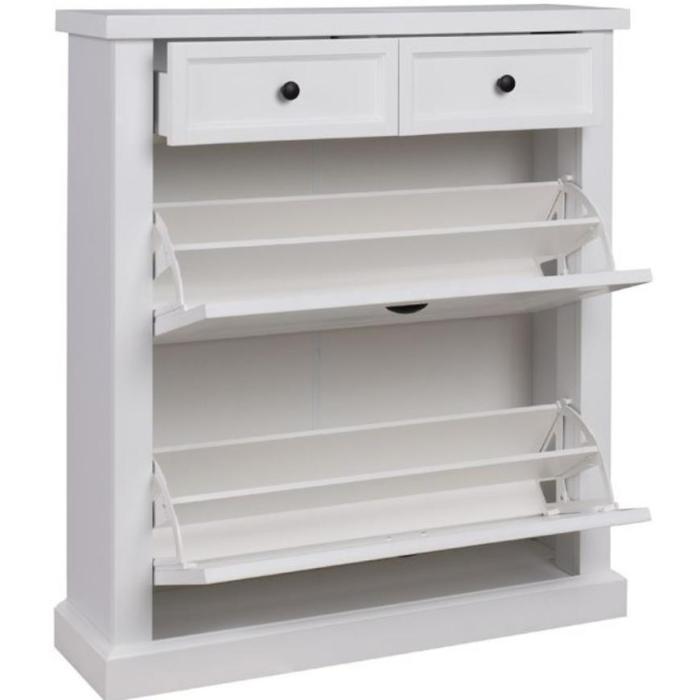 Szafka na buty posiada dwie uchylne szafki na obuwie oraz dwie szuflady. Materiał wykonania to płyta wiórowa laminowana.