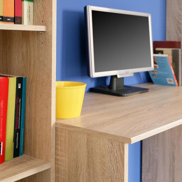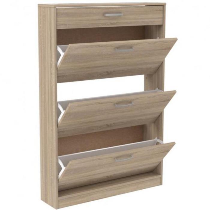 Szafka na buty posiada trzy uchylne półki na obuwie oraz jedną szufladę na drobne akcesoria. Materiał wykonania to płyta wiórowa laminowana.