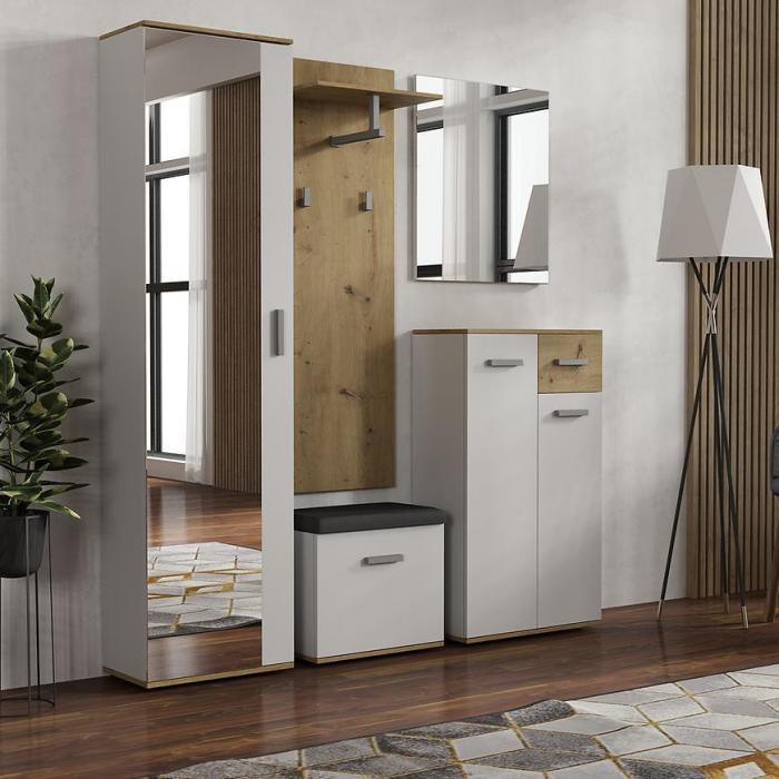 Kolekcja mebli do przedpokoju Justus to perfekcyjne połączenie funkcjonalności, elegancji i nowoczesnego designu. Każdy element tej kolekcji jest starannie wykonany z płyty wiórowej laminowanej, co zapewnia nie tylko trwałość, ale także estetyczny wygląd. Dostępna w białym dekorze z elementami w kolorze dąb artisan przyciąga kolorystycznym połączeniem, która nadaje wnętrzu wyjątkowego charakteru.