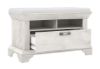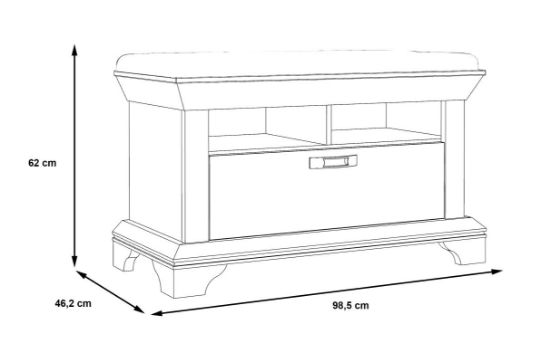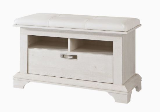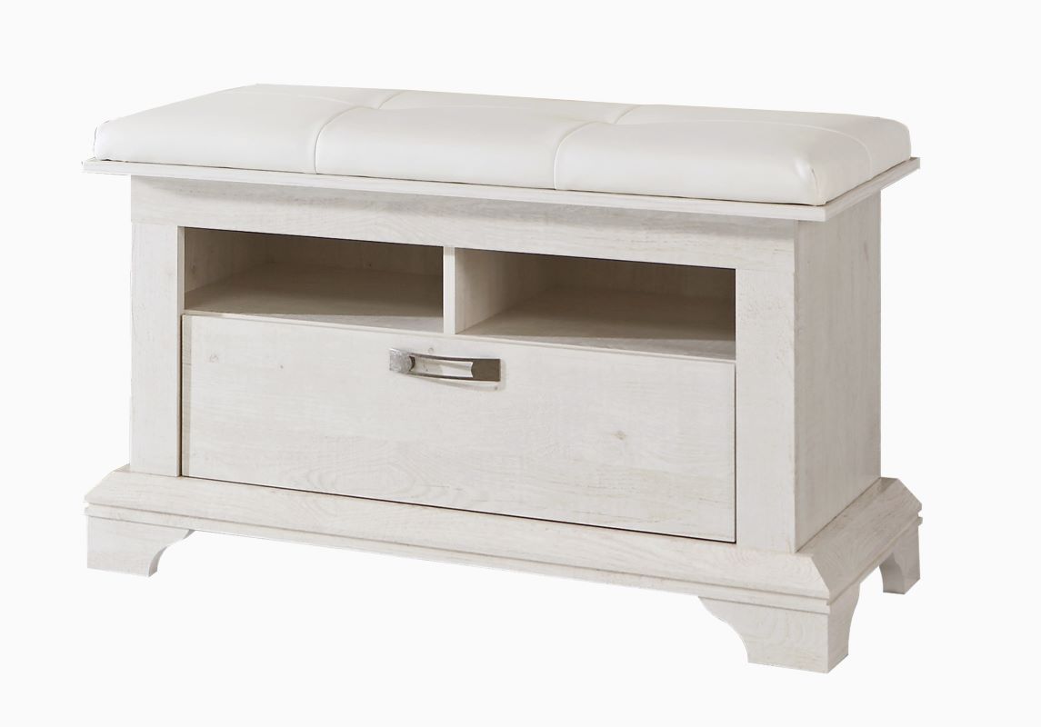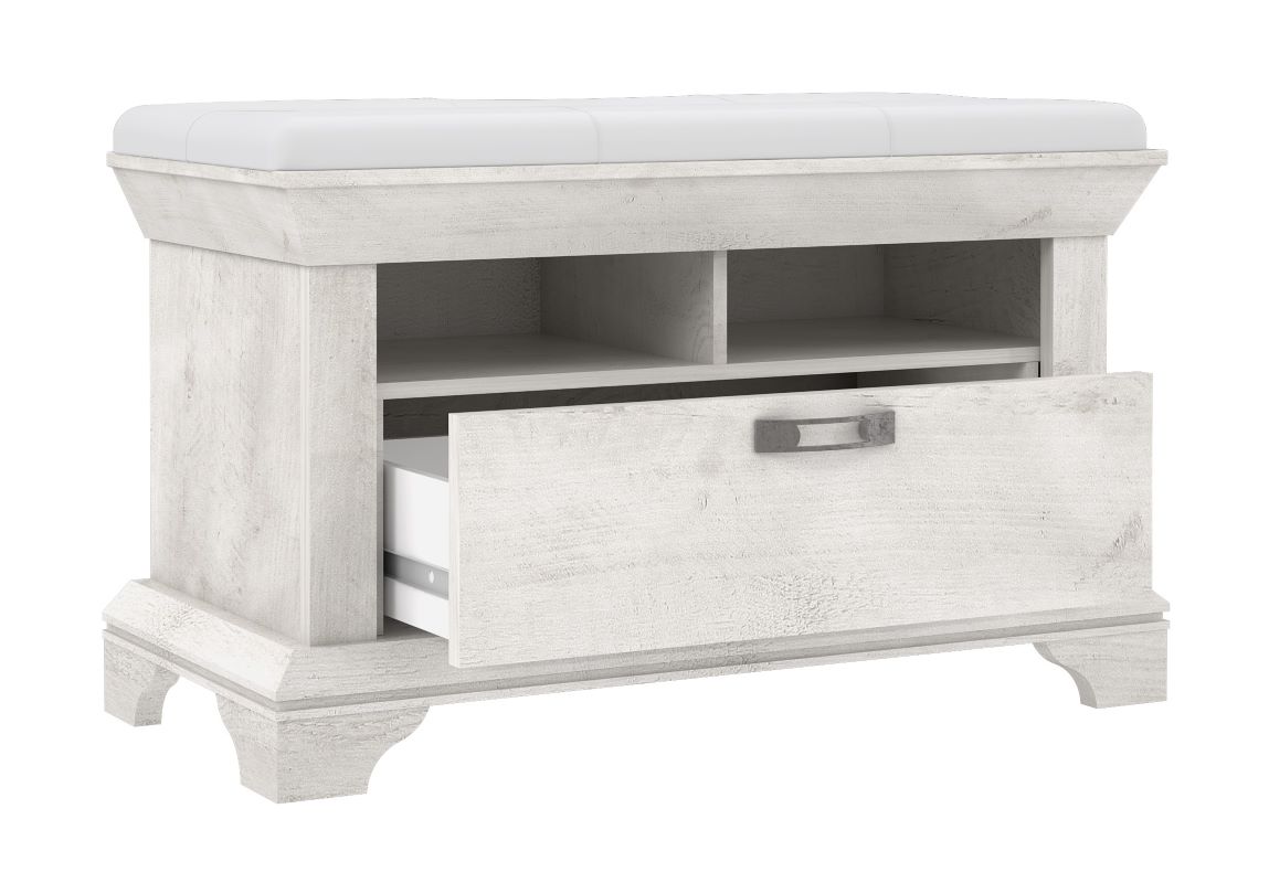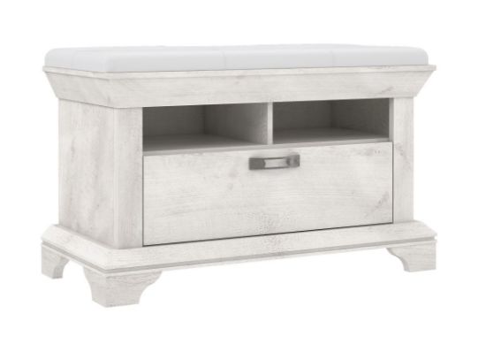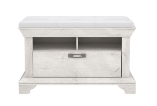 Szafka na buty Kashmir KSMD12-D43 dostępna w dekorze Pinia Biała. Szafka posiada jedną szufladę oraz tapicerowane siedzisko. Siedzisko tapicerowane jest ekoskórą w kolorze białym.  Na froncie szuflady znajduje się metalowy uchwyt w kolorze imitującym stare srebro. Maksymalne obciążenie blatu górnego to 80kg, maksymalne obciążenie szuflady to 3kg. Masywny cokół ze stylizowanymi nóżkami oraz pogrubiony, frezowany wieniec nadają jej niepowtarzalny charakter