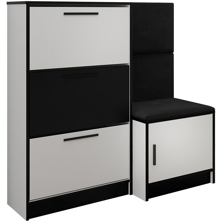 Nowoczesna szafka na buty Kpl Foli w eleganckim połączeniu białych frontów z subtelnym czarnym akcentem ITAKA 15 łączy stylowy design z funkcjonalnością. Wykonana z trwałej płyty wiórowej laminowanej, z matowym wykończeniem frontów i korpusu, zapewnia solidność i nowoczesny wygląd. Wysoka na 124,7 cm, szeroka 123,6 cm i głęboka 39 cm, oferuje przestronne miejsce do przechowywania butów, pomagając utrzymać porządek. Produkt wymaga złożenia i doskonale wpisuje się w nowoczesne wnętrza, łącząc styl i wygodę użytkowania z białym korpusem.