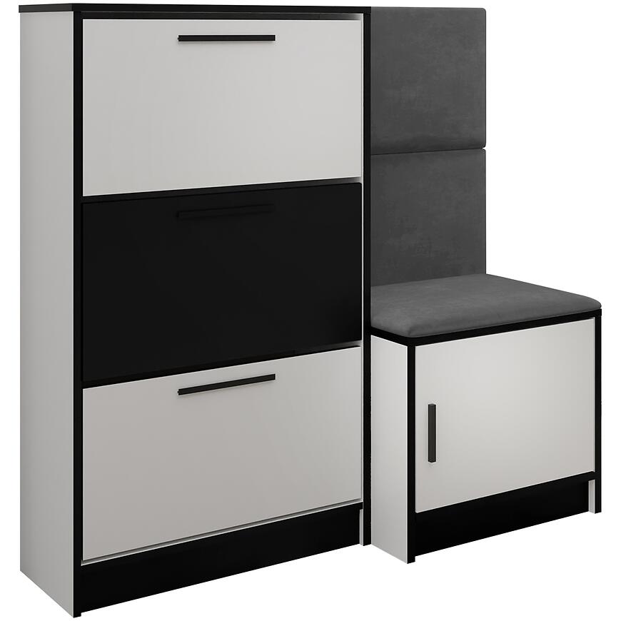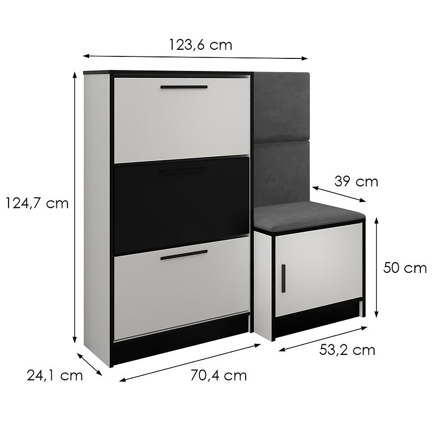 Nowoczesna szafka na buty Kpl Foli w eleganckim połączeniu białych frontów z subtelnym szarym akcentem ITAKA 50 łączy stylowy design z funkcjonalnością. Wykonana z trwałej płyty wiórowej laminowanej, z matowym wykończeniem frontów i korpusu, zapewnia solidność i nowoczesny wygląd. Wysoka na 124,7 cm, szeroka 123,6 cm i głęboka 39 cm, oferuje przestronne miejsce do przechowywania butów, pomagając utrzymać porządek. Produkt wymaga złożenia i doskonale wpisuje się w nowoczesne wnętrza, łącząc styl i wygodę użytkowania z białym korpusem.