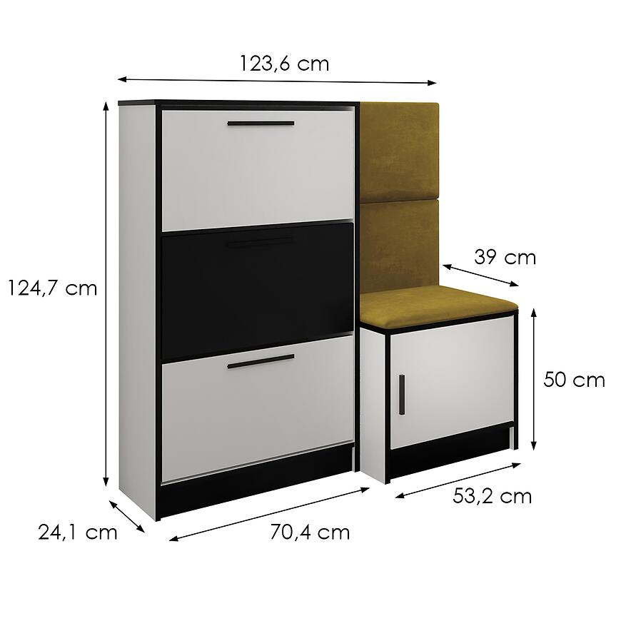 Nowoczesna szafka na buty Kpl Foli w eleganckim połączeniu białych frontów z wyrazistym żółtym akcentem KRONOS 01 łączy stylowy design z funkcjonalnością. Wykonana z trwałej płyty wiórowej laminowanej, z matowym wykończeniem frontów i korpusu, zapewnia solidność i nowoczesny wygląd. Wysoka na 124,7 cm, szeroka 123,6 cm i głęboka 39 cm, oferuje przestronne miejsce do przechowywania butów, pomagając utrzymać porządek. Produkt wymaga złożenia i doskonale wpisuje się w nowoczesne wnętrza, łącząc styl i wygodę użytkowania z białym korpusem.