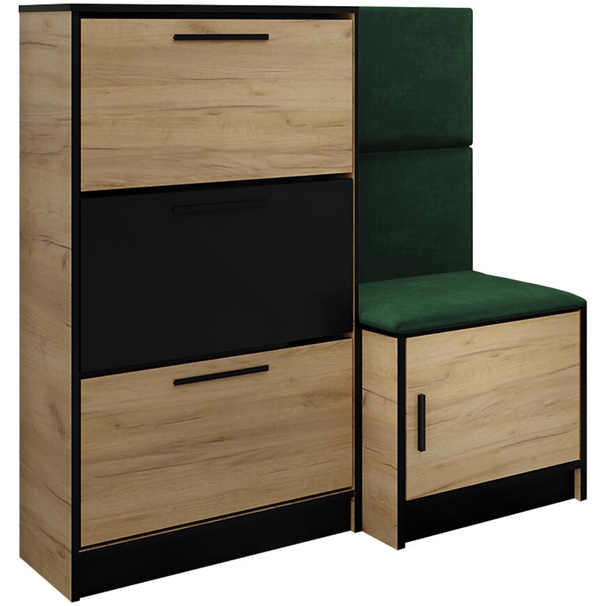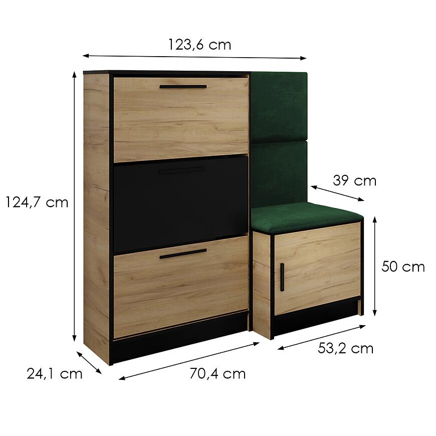 Nowoczesna szafka na buty Kpl Foli w eleganckim połączeniu frontów w kolorze dąb craft złoty z wyrazistym zielonym akcentem KRONOS 19 łączy stylowy design z funkcjonalnością. Wykonana z trwałej płyty wiórowej laminowanej, z matowym wykończeniem frontów i korpusu, zapewnia solidność i nowoczesny wygląd. Wysoka na 124,7 cm, szeroka 123,6 cm i głęboka 39 cm, oferuje przestronne miejsce do przechowywania butów, pomagając utrzymać porządek. Produkt wymaga złożenia i doskonale wpisuje się w nowoczesne wnętrza, łącząc styl i wygodę użytkowania z dąb craft złotym korpusem.