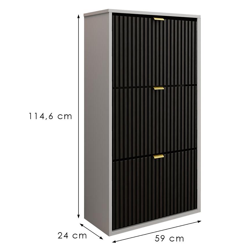 Nowoczesna szafka na buty Laro I stojąca w eleganckim połączeniu czarnych frontów ze subtelnym akcentem złotego wybarwienia łączy stylowy design z funkcjonalnością. Wykonana z trwałej płyty wiórowej laminowanej, z matowym wykończeniem frontów i korpusu, gwarantuje solidność i elegancki wygląd. Wysoka na 114,6 cm, szeroka 59 cm i głęboka 24 cm, oferuje praktyczne miejsce do przechowywania butów, ułatwiając utrzymanie porządku. Produkt wymaga złożenia i doskonale wpisuje się w nowoczesne wnętrza, łącząc design z wygodą użytkowania i białym korpusem.