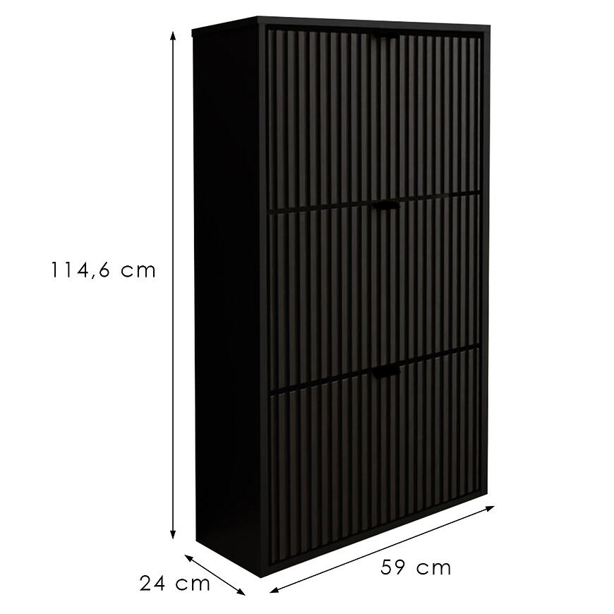 Nowoczesna szafka na buty Laro I stojąca w eleganckim czarnym kolorze łączy minimalistyczny design z funkcjonalnością, tworząc stylowy element wyposażenia przedpokoju. Wykonana z trwałej płyty wiórowej laminowanej, z matowym wykończeniem frontów i korpusu, zapewnia solidność i wytrzymałość. Wysoka na 114,6 cm, szeroka 59 cm i głęboka 24 cm, oferuje praktyczne miejsce do przechowywania butów, ułatwiając utrzymanie porządku. Produkt wymaga złożenia i idealnie wpisuje się w nowoczesne wnętrza, łącząc styl z wygodą użytkowania.