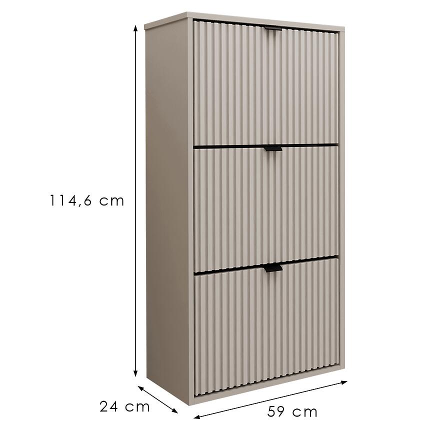 Nowoczesna szafka na buty Laro I stojąca w eleganckim połączeniu frontów w kolorze kaszmir z subtelnym beżowym wybarwieniem łączy stylowy design z funkcjonalnością. Wykonana z trwałej płyty wiórowej laminowanej, z matowym wykończeniem frontów i korpusu, gwarantuje solidność i nowoczesny wygląd. Wysoka na 114,6 cm, szeroka 59 cm i głęboka 24 cm, oferuje praktyczne miejsce do przechowywania butów, pomagając utrzymać porządek. Produkt wymaga złożenia i doskonale wpisuje się w nowoczesne wnętrza, łącząc elegancję z wygodą użytkowania i kaszmirowym korpusem.