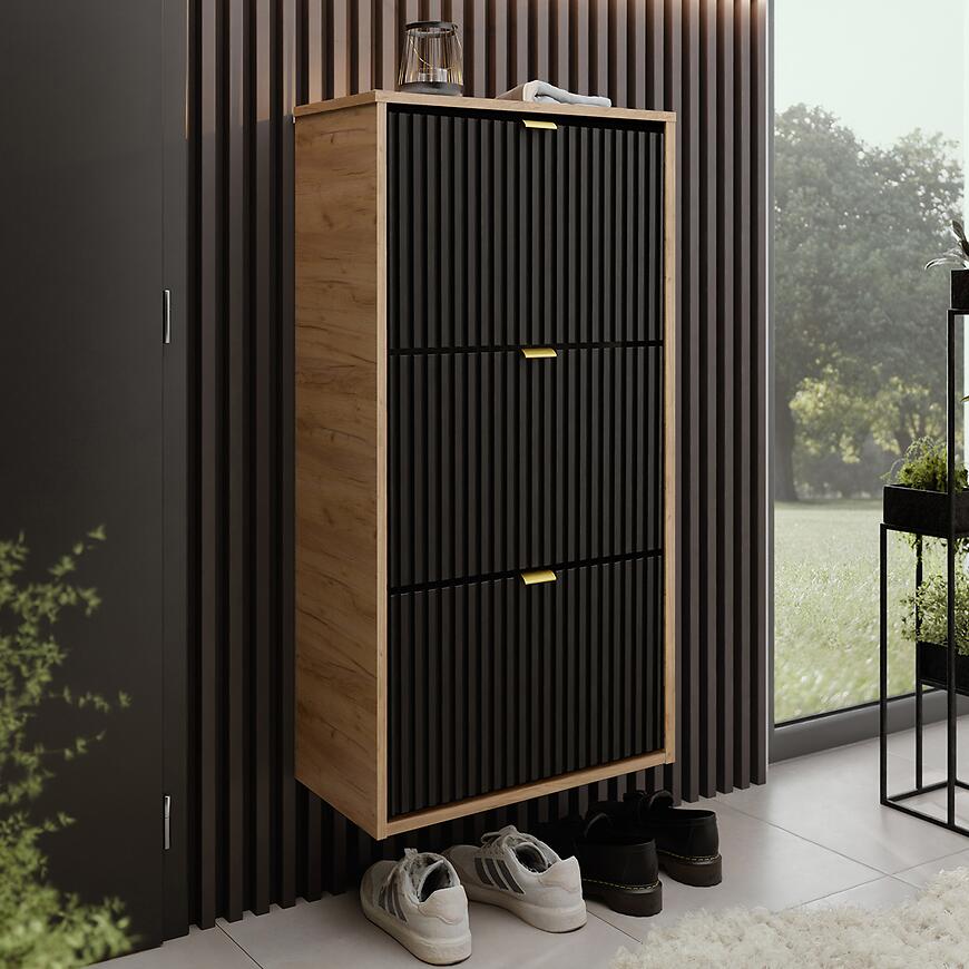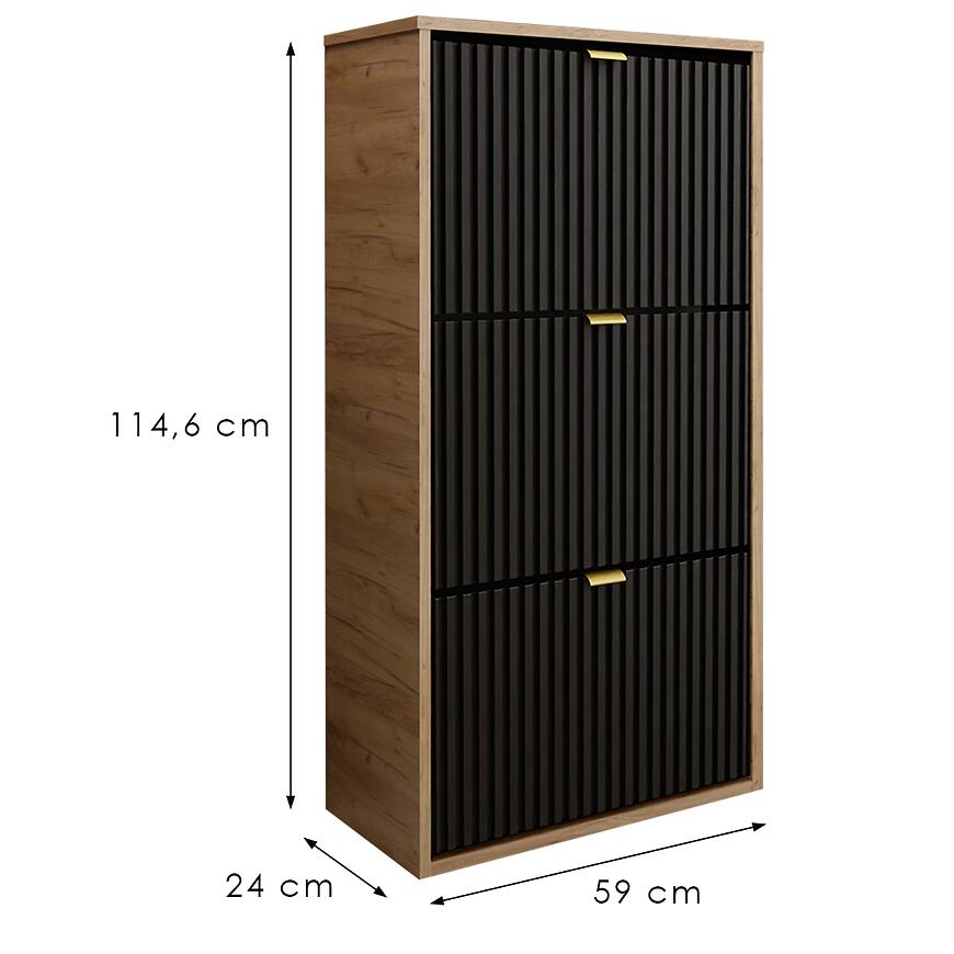 Nowoczesna wisząca szafka na buty Laro I w eleganckim połączeniu czarnych frontów ze stylowym akcentem złotego wybarwienia łączy minimalistyczny design z funkcjonalnością. Wykonana z trwałej płyty wiórowej laminowanej, z matowym wykończeniem frontów i korpusu, zapewnia solidność i elegancki wygląd. Wysoka na 114,6 cm, szeroka 59 cm i głęboka 24 cm, oferuje praktyczne miejsce do przechowywania butów, pomagając utrzymać porządek. Produkt wymaga złożenia i doskonale wpisuje się w nowoczesne wnętrza, łącząc styl i wygodę użytkowania z dębowym korpusem craft złoty.