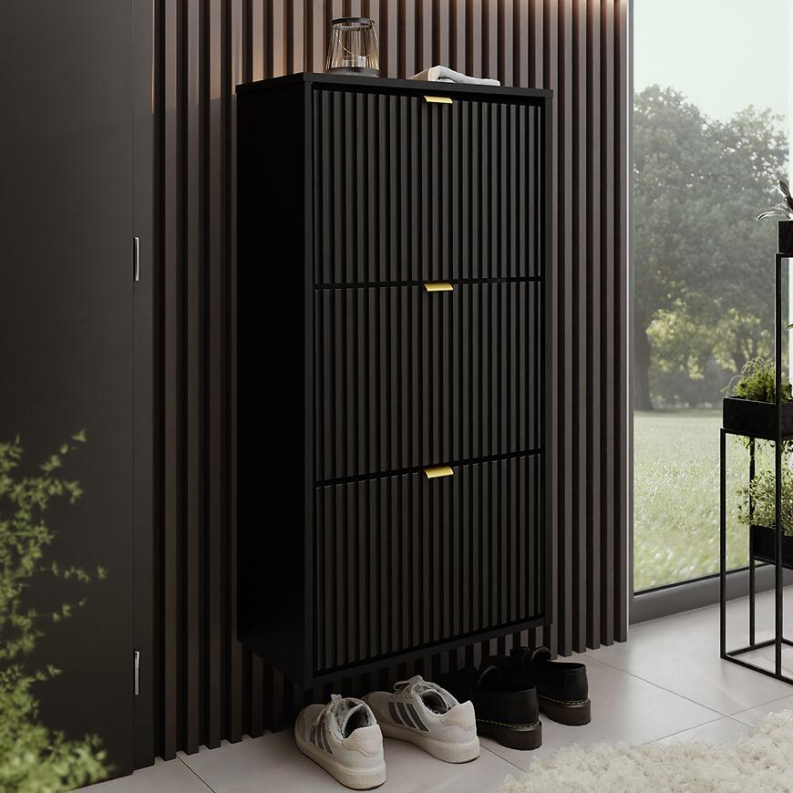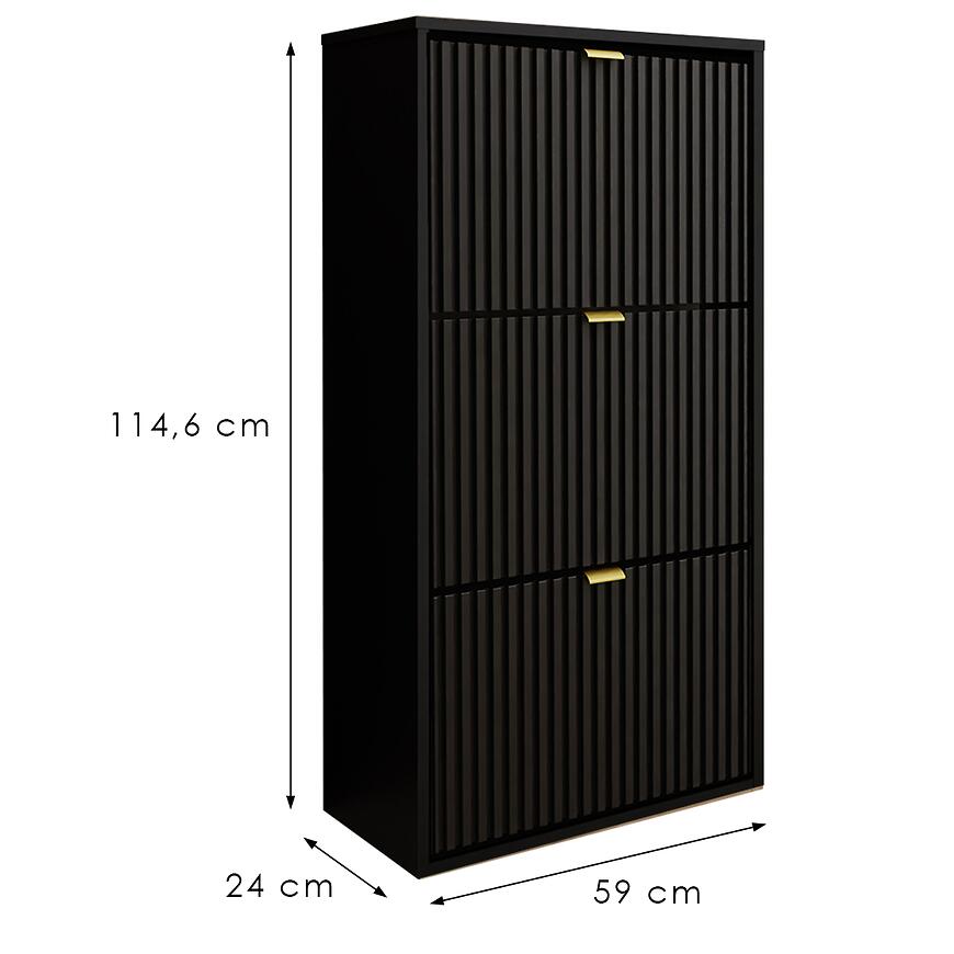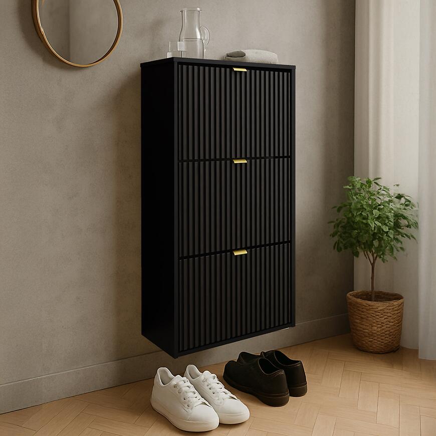 Nowoczesna wisząca szafka na buty Laro I w eleganckim połączeniu czarnych frontów ze stylowym akcentem złotego wybarwienia łączy minimalistyczny design z funkcjonalnością. Wykonana z trwałej płyty wiórowej laminowanej, z matowym wykończeniem frontów i korpusu, zapewnia solidność i elegancki wygląd. Wysoka na 114,6 cm, szeroka 59 cm i głęboka 24 cm, oferuje praktyczne miejsce do przechowywania butów, pomagając utrzymać porządek. Produkt wymaga złożenia i doskonale wpisuje się w nowoczesne wnętrza, łącząc styl i wygodę użytkowania z czarnym korpusem.