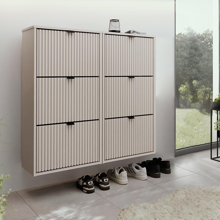 Nowoczesna wisząca szafka na buty Laro II w eleganckim połączeniu frontów w kolorze kaszmir z subtelnym beżowym wybarwieniem łączy stylowy design z funkcjonalnością. Wykonana z trwałej płyty wiórowej laminowanej, z matowym wykończeniem frontów i korpusu, gwarantuje solidność i nowoczesny wygląd. Wysoka na 114,6 cm, szeroka 118 cm i głęboka 24 cm, oferuje przestronne miejsce do przechowywania butów, pomagając utrzymać porządek. Produkt wymaga złożenia i doskonale wpisuje się w nowoczesne wnętrza, łącząc styl i wygodę użytkowania z kaszmirowym korpusem.