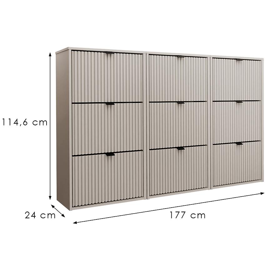 Nowoczesna szafka na buty Laro III stojąca w eleganckim połączeniu frontów w kolorze kaszmir z subtelnym beżowym wybarwieniem łączy stylowy design z funkcjonalnością. Wykonana z trwałej płyty wiórowej laminowanej, z matowym wykończeniem frontów i korpusu, zapewnia solidność i nowoczesny wygląd. Wysoka na 114,6 cm, szeroka 177 cm i głęboka 24 cm, oferuje przestronne miejsce do przechowywania butów, pomagając utrzymać porządek. Produkt wymaga złożenia i doskonale wpisuje się w nowoczesne wnętrza, łącząc styl i wygodę użytkowania z kaszmirowym korpusem.
