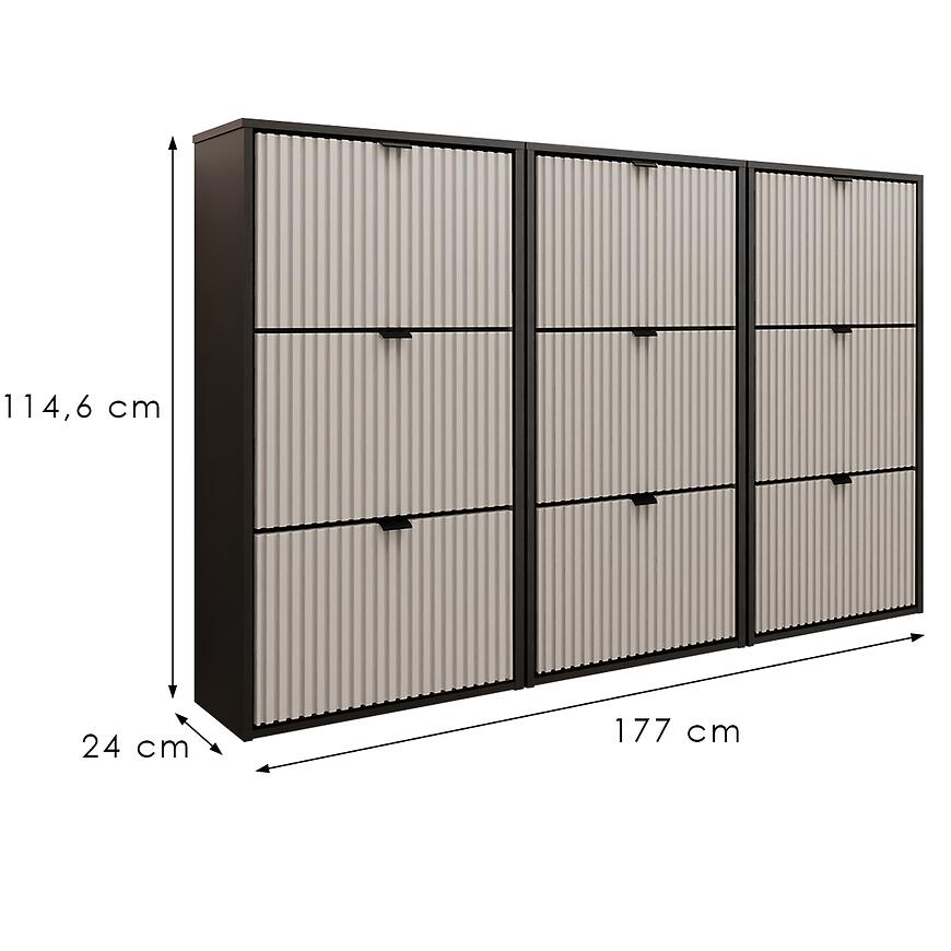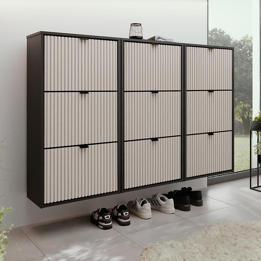 Nowoczesna wisząca szafka na buty Laro III w eleganckim połączeniu frontów w kolorze kaszmir z subtelnym beżowym wybarwieniem łączy stylowy design z funkcjonalnością. Wykonana z trwałej płyty wiórowej laminowanej, z matowym wykończeniem frontów i korpusu, zapewnia solidność i nowoczesny wygląd. Wysoka na 114,6 cm, szeroka 177 cm i głęboka 24 cm, oferuje przestronne miejsce do przechowywania butów, pomagając utrzymać porządek. Produkt wymaga złożenia i doskonale wpisuje się w nowoczesne wnętrza, łącząc styl i wygodę użytkowania z czarnym korpusem.