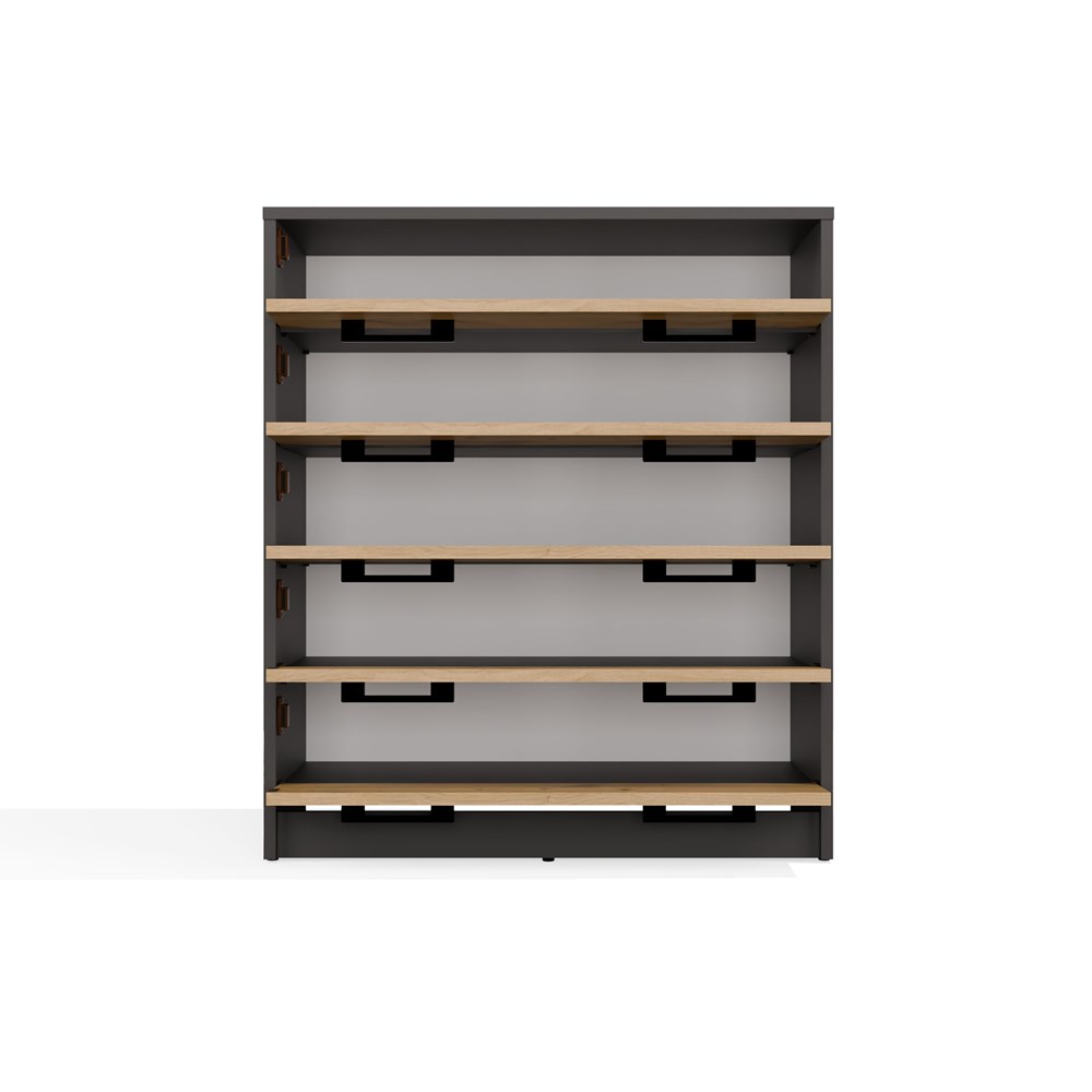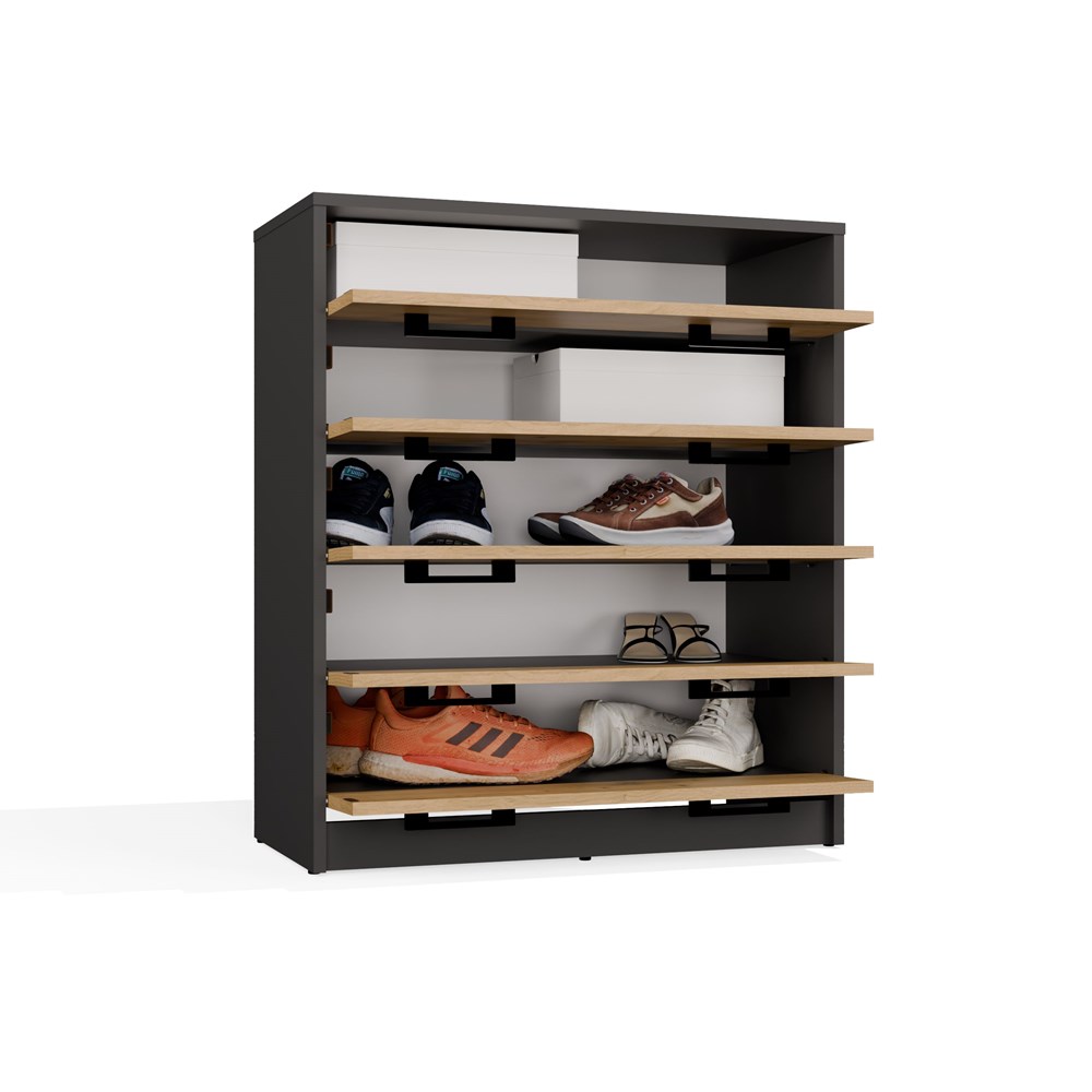 Szafka posiada 5 uchylnych drzwiczek, dzięki którym dostęp do wnętrza jest wygodny i szybki. Każde drzwi wyposażone są w dwa czarne uchwyty, co ułatwia otwieranie i dodaje nowoczesnego wyglądu. Przemyślana konstrukcja pozwala pomieścić większą ilość obuwia, zarówno codziennego, jak i sezonowego. Dzięki temu szafka Lexa pozwala utrzymać porządek w przedpokoju i sprawia, że każda para butów ma swoje miejsce.