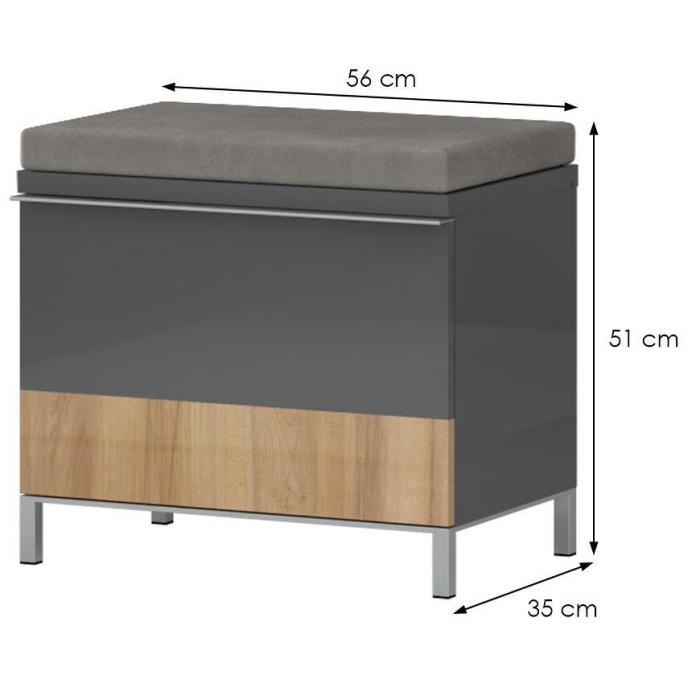 Szafka na buty Onyx w kolorze anthracite/pacific walnut to bardzo praktyczny mebel do każdego przedpokoju. Szafka na buty posiada jedną szafkę na obuwie oraz siedzisko. Materiał wykonania to płyta wiórowa lakierowana/płyta wiórowa laminowana. Mebel do samodzielnego montażu.