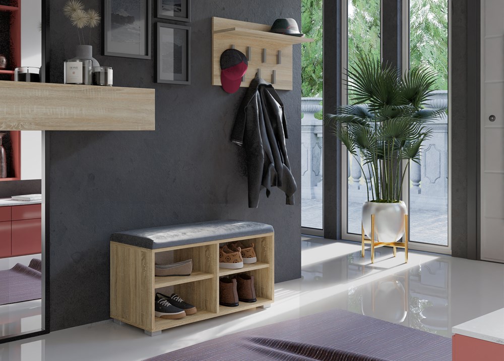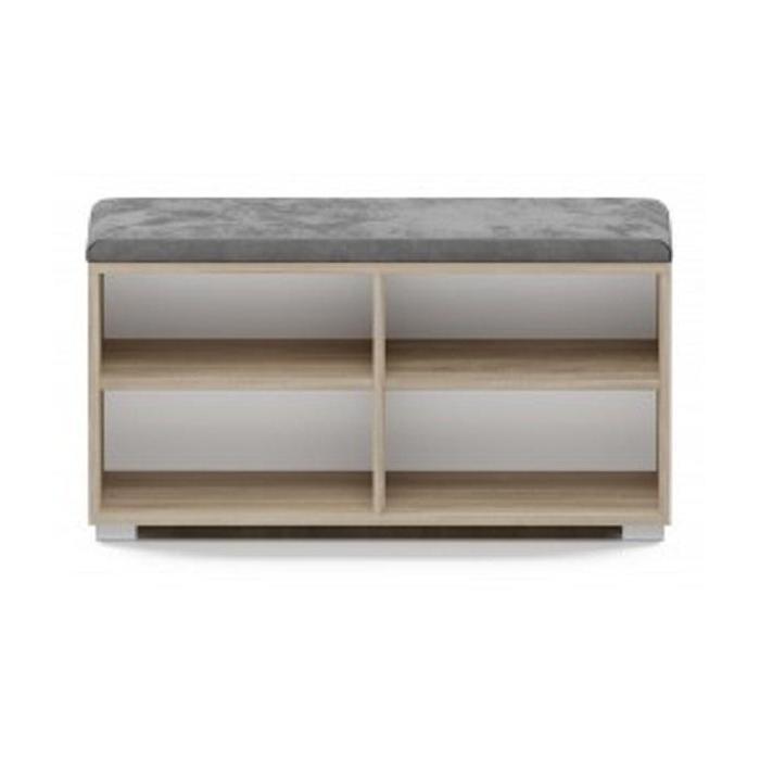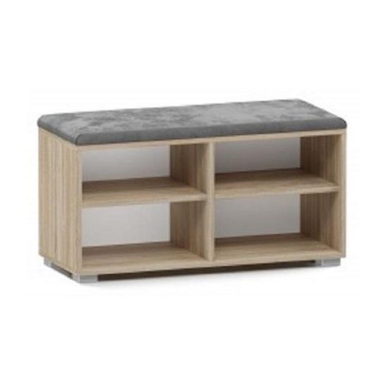 Szafka na buty Opi w kolorze dąb sonoma to bardzo praktyczny mebel do każdego przedpokoju. Szafka na buty posiada siedzisko oraz cztery otwarte półki na obuwie. Materiał wykonania to płyta laminowana, a obrzeża – wykończone tworzywem ABS. Mebel do samodzielnego montażu.