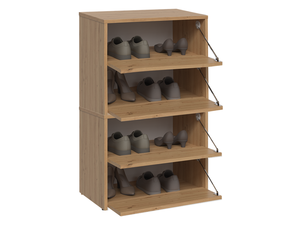 Wnętrze szafki kryje w sobie cztery pojemne półki na buty. Dzięki temu masz wystarczająco miejsca na przechowywanie różnych rodzajów obuwia, niezależnie od pory roku lub okazji. To idealne rozwiązanie, aby utrzymać porządek w swoim wejściu lub sypialni.