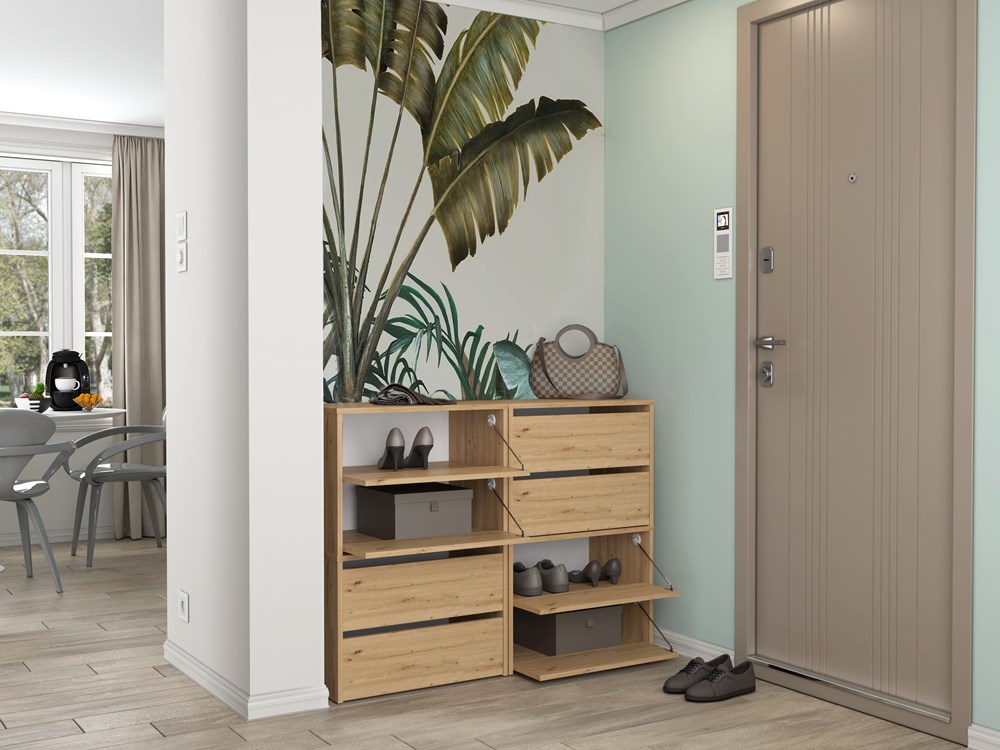 Szafka wyposażona jest w uchylne drzwiczki, które sprawiają, że korzystanie z niej jest wyjątkowo wygodne. Dzięki tym z łatwością ukryjesz swoje obuwie, zachowując uporządkowany wygląd w swojej przestrzeni.