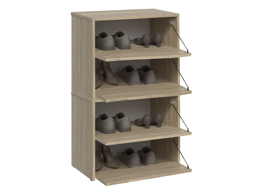 Wnętrze szafki kryje w sobie cztery pojemne półki na buty. Dzięki temu masz wystarczająco miejsca na przechowywanie różnych rodzajów obuwia, niezależnie od pory roku lub okazji. To idealne rozwiązanie, aby utrzymać porządek w swoim wejściu lub sypialni.