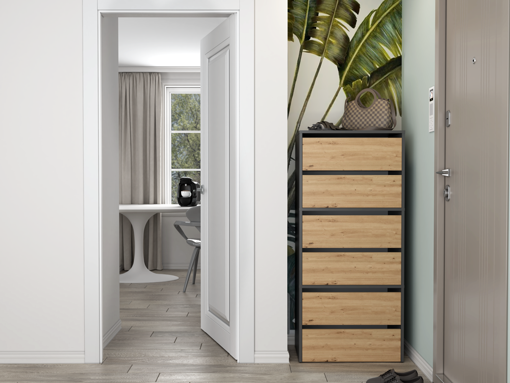 Szafka na buty Pelagia w kolorze antracyt/dąb artisan to bardzo praktyczny mebel do każdego przedpokoju. Szafka na buty posiada uchylne drzwi z dwoma pojemnymi półkami. Materiał wykonania to płyta laminowana. Dodatkowym atutem jest możliwość stworzenia własnego zestawu, gdyż szafka jest modułowa. Mebel do samodzielnego montażu.