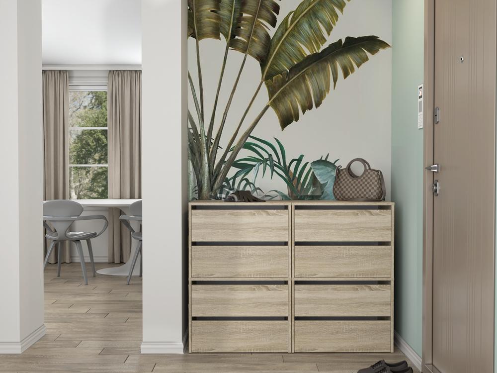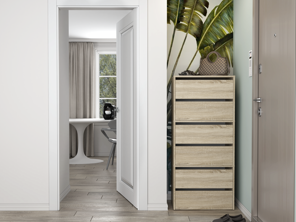 Szafka na buty Pelagia w kolorze dąb sonoma to bardzo praktyczny mebel do każdego przedpokoju. Szafka na buty posiada uchylne drzwi z dwoma pojemnymi półkami. Materiał wykonania to płyta laminowana. Dodatkowym atutem jest możliwość stworzenia własnego zestawu, gdyż szafka jest modułowa. Mebel do samodzielnego montażu.