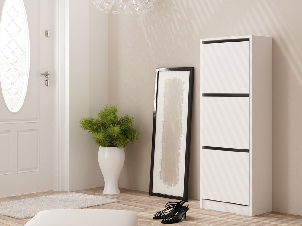 Szafka na buty Sofia S3 to bardzo niezwykle praktyczny mebel do każdego przedpokoju. Szafka na buty Sofia S3 posiada funkcjonalne uchylne drzwiczki, za którymi znajduje się trzyrzędowy kosz na obuwie z tworzywa sztucznego. Wszystko to zamknięto w wymiarach 49x137x28 cm. Na uwagę zasługuje fakt, że szafka na buty Sofia S3 wykonana została z płyty laminowanej, co zapewnia jej wyjątkową wytrzymałość oraz solidność. Szafka na buty w kolorze białym.