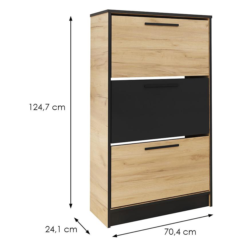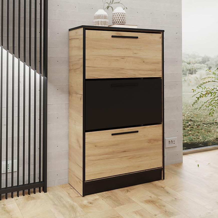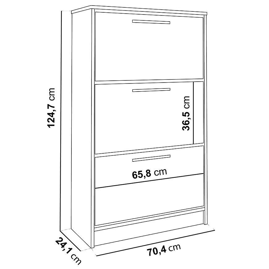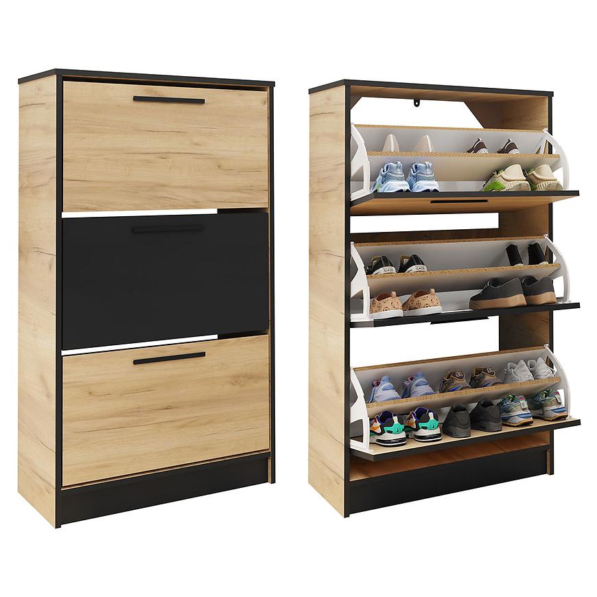 Nowoczesna Szafka na buty SZNB01 to świetne rozwiązanie jeśli chodzi o organizację przestrzeni w przedpokoju. Szafka jest bardzo pojemna. Posiada 3 szafki, które dodatkowo dzielone są w środku na pół. Uniersalna kolorystyka pozwoli zaaranżować przestrzeń w każdym stylu. Szafki wykonane z płyty wiórowej laminowanej.