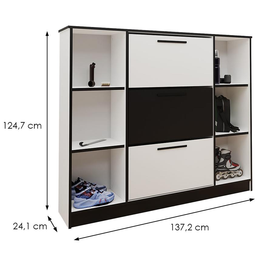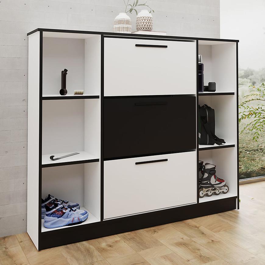 Nowoczesna Szafka na buty SZNB02 to świetne rozwiązanie jeśli chodzi o organizację przestrzeni w przedpokoju. Szafka jest bardzo pojemna. Posiada zamykane 3 szafki, które dodatkowo dzielone są w środku na pół oraz 6 otwartych półek. Uniersalna kolorystyka pozwoli zaaranżować przestrzeń w każdym stylu. Szafki wykonane z płyty wiórowej laminowanej.