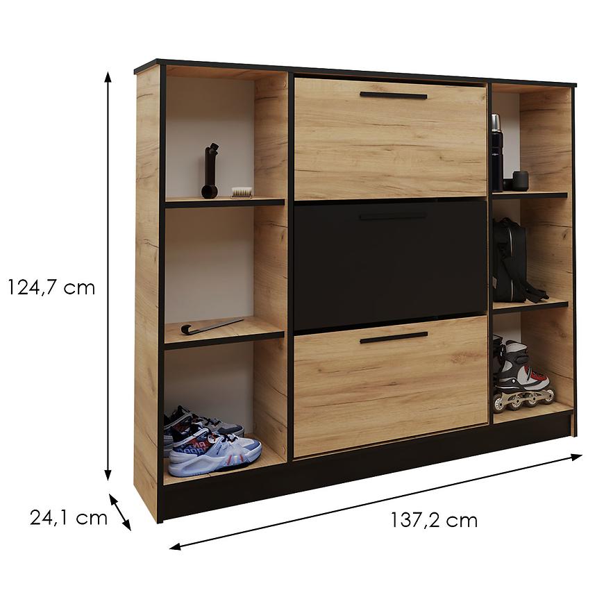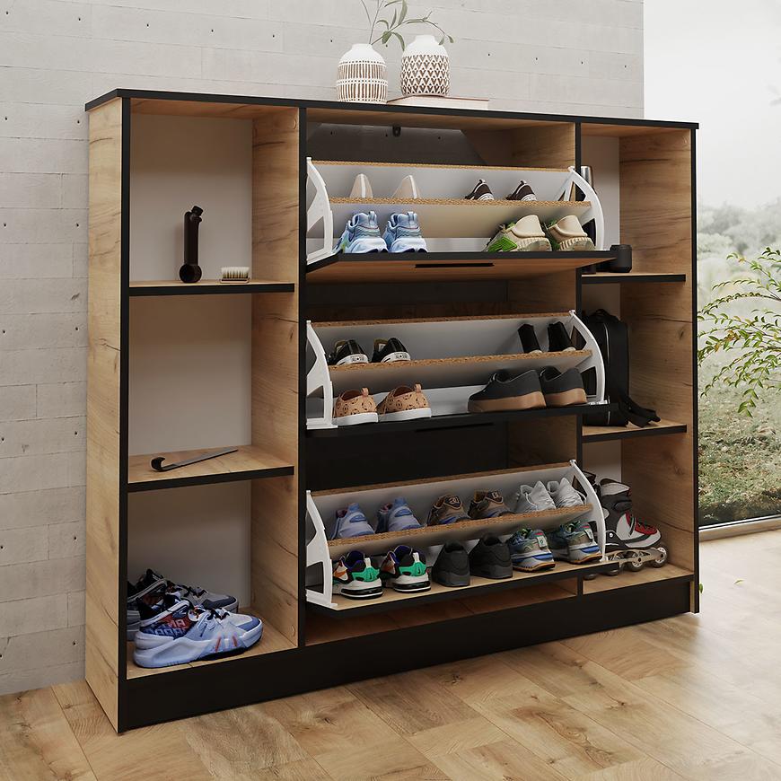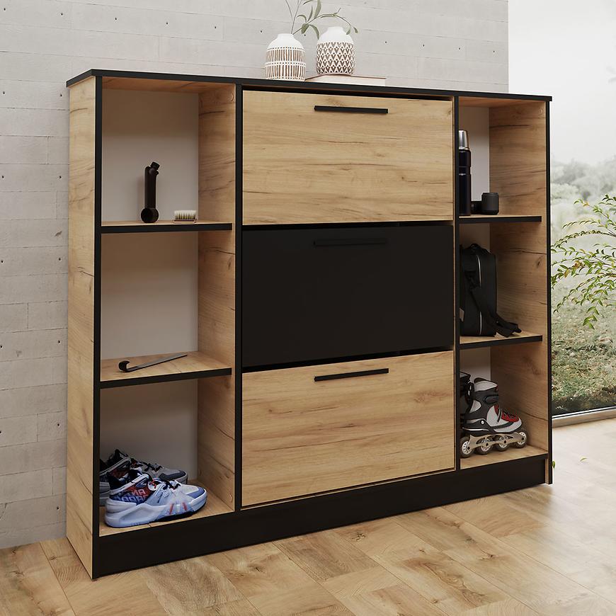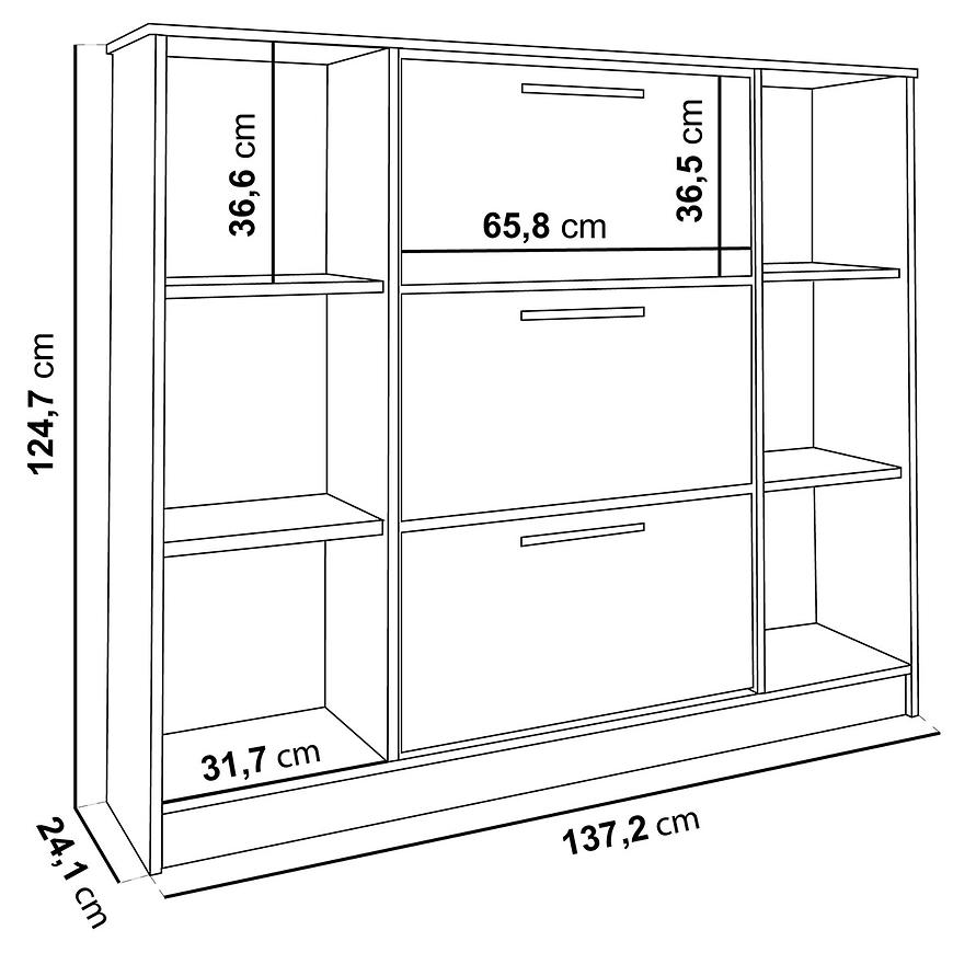 Nowoczesna Szafka na buty SZNB02 to świetne rozwiązanie jeśli chodzi o organizację przestrzeni w przedpokoju. Szafka jest bardzo pojemna. Posiada zamykane 3 szafki, które dodatkowo dzielone są w środku na pół oraz 6 otwartych półek. Uniersalna kolorystyka pozwoli zaaranżować przestrzeń w każdym stylu. Szafki wykonane z płyty wiórowej laminowanej.
