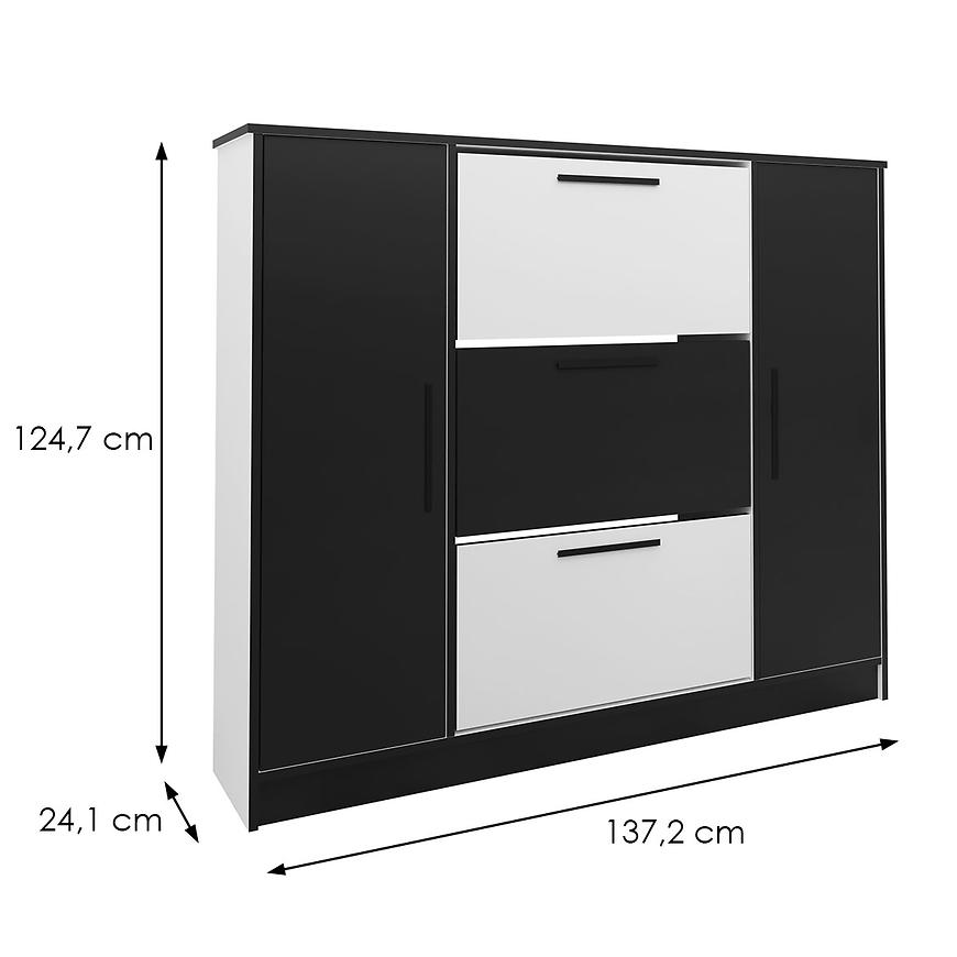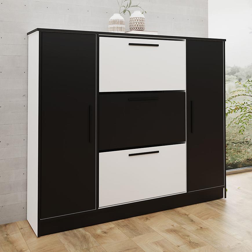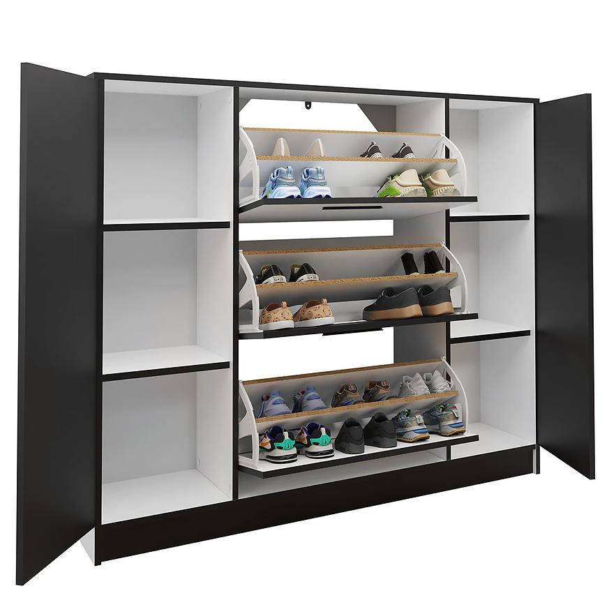 Nowoczesna Szafka na buty SZNB02D to świetne rozwiązanie jeśli chodzi o organizację przestrzeni w przedpokoju. Szafka jest bardzo pojemna. Posiada zamykane 3 szafki, które dodatkowo dzielone są w środku na pół oraz 6 otwartych półek. Uniersalna kolorystyka pozwoli zaaranżować przestrzeń w każdym stylu. Szafki wykonane z płyty wiórowej laminowanej.