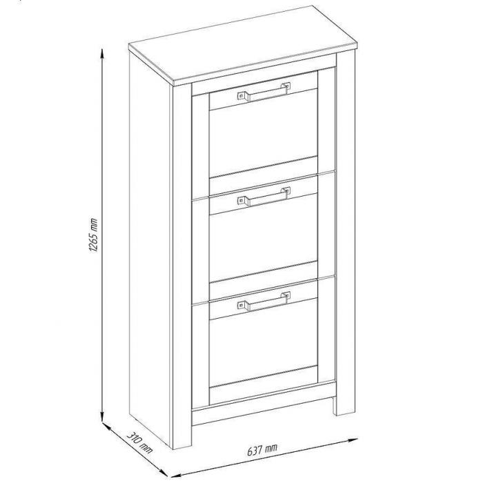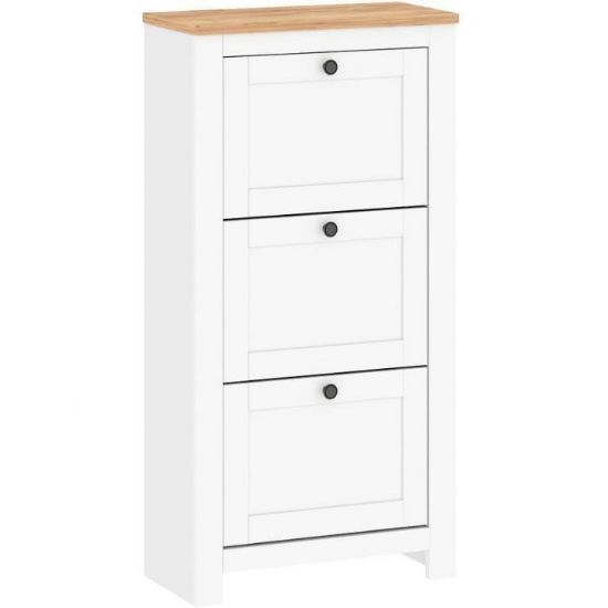 Szafka na buty Vesper 3 w kolorze biały/wotan to funkcjonalny mebel do przedpokoju, który łączy klasyczny styl z praktycznym designem. Wyposażona w 3 pojemne szuflady, pozwala na wygodne przechowywanie obuwia. Wykonana z płyty wiórowej laminowanej w matowym wykończeniu, cechuje się trwałością i estetyką. Kompaktowe wymiary 126,5 × 63,7 × 31 cm sprawiają, że idealnie sprawdzi się nawet w mniejszych przestrzeniach. Lekka (15,5 kg) i łatwa w montażu, stanowi część kolekcji VESPER – idealna do uporządkowanego i schludnego wnętrza.