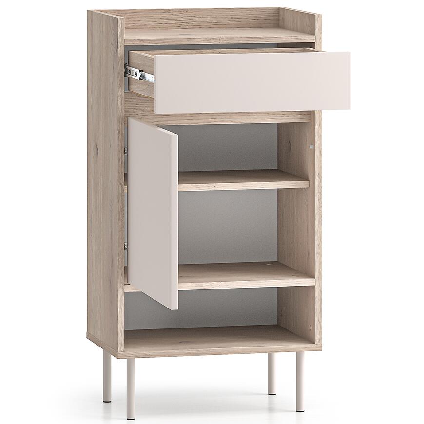 Szafka na buty Voco 04 Dąb Cremona/Cashmere to elegancki mebel łączący klasyczny design z praktycznym wykorzystaniem przestrzeni. Jasne drewnopodobne wybarwienie dąb cremona terracotta w połączeniu z frontami w odcieniu cashmere wprowadza do wnętrza przytulny i harmonijny charakter, podkreślając subtelną elegancję. Matowe wykończenie frontów i korpusu nadaje szafce wyrafinowanego wyglądu, który doskonale komponuje się z klasycznymi aranżacjami wnętrz.