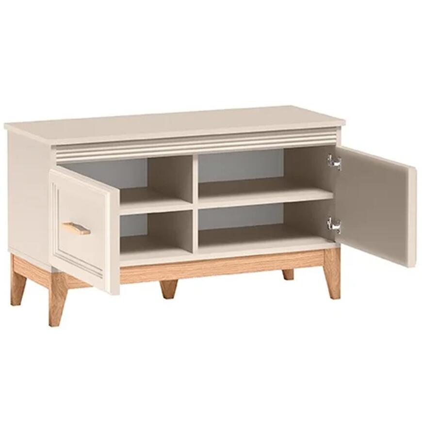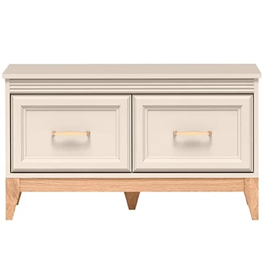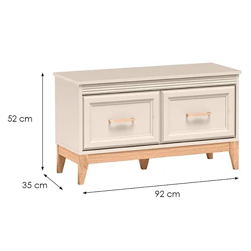 Szafka na buty Windsor W-20 w kolorze kashmir z dodatkiem dębu naturalnego łączy nowoczesny, skandynawski design z praktycznymi rozwiązaniami do przechowywania obuwia. Matowe wykończenie frontów i korpusu nadaje meblowi elegancki, minimalistyczny charakter, który harmonijnie wpisuje się w różnorodne aranżacje wnętrz.