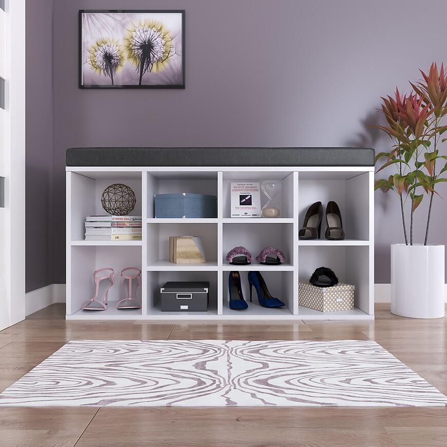 Szafka na buty z siedziskiem biały/grafit 54,5x104x30 to praktyczny i funkcjonalny mebel, wykonany z płyty wiórowej laminowanej w kolorze białym. Wyposażona w siedzisko, zapewnia wygodę podczas zakładania obuwia oraz praktyczne miejsce do przechowywania butów. Matowe wykończenie podkreśla elegancki, klasyczny charakter mebla, a produkt wymaga samodzielnego montażu.