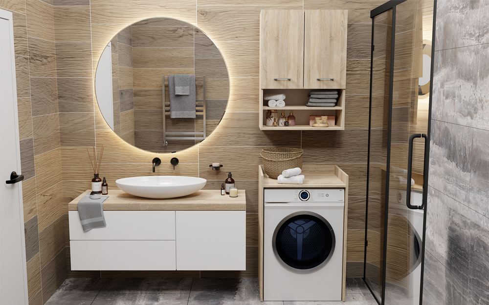 Nowoczesna szafka na pralkę sprosta oczekiwaniom wszystkich, którzy cenią praktyczne rozwiązania. Szafka posiada półkę. Mebel wykonany z płyty wiórowej laminowanej Szafka charakteryzuje się minimalistyczną konstrukcją, zastosowano nowy typ okuć oraz gładkie boki bez zaślepek. Powierzchnię mebla czyścić przy pomocy miękkiej szmatki. Unikać stosowania silnie działających środków chemicznych.