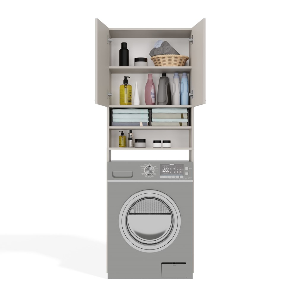 Szafka na pralkę Kara Dk w wersji z krótkimi drzwiami to funkcjonalny i nowoczesny mebel, który pozwala maksymalnie wykorzystać przestrzeń nad pralką. Dzięki przestronnej wnęce dopasowanej do standardowych modeli o szerokości 60,8 cm i wysokości 90,5 cm, szafka idealnie komponuje się z wyposażeniem łazienki, nie zajmując dodatkowej powierzchni podłogi. Za eleganckimi frontami w kolorze kaszmiru ukryto dwie praktyczne półki, które doskonale sprawdzą się do przechowywania ręczników, kosmetyków, detergentów oraz innych akcesoriów niezbędnych w codziennym użytkowaniu.