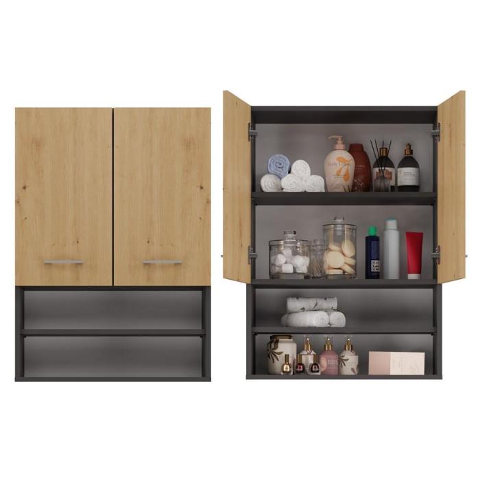 Nowoczesny szafka to praktyczne rozwiązania do łazienki, aby jeszcze lepiej ją zagospodarować. Szafka posiada 2 półki schowane za drzwiczkami oraz 2 półki odsłonięte. Obrzeża – wykończone tworzywem PCV (charakteryzującym się dużą wytrzymałością mechaniczną i chemiczną). Szafka charakteryzuje się minimalistyczną konstrukcją, zastosowano nowy typ okuć oraz gładkie boki bez zaślepek. Przestronna szafka łazienkowa na ręczniki, środki czystości i inne akcesoria łazienkowe. Powierzchnię mebla czyścić przy pomocy miękkiej szmatki. Unikać stosowania silnie działających środków chemicznych.